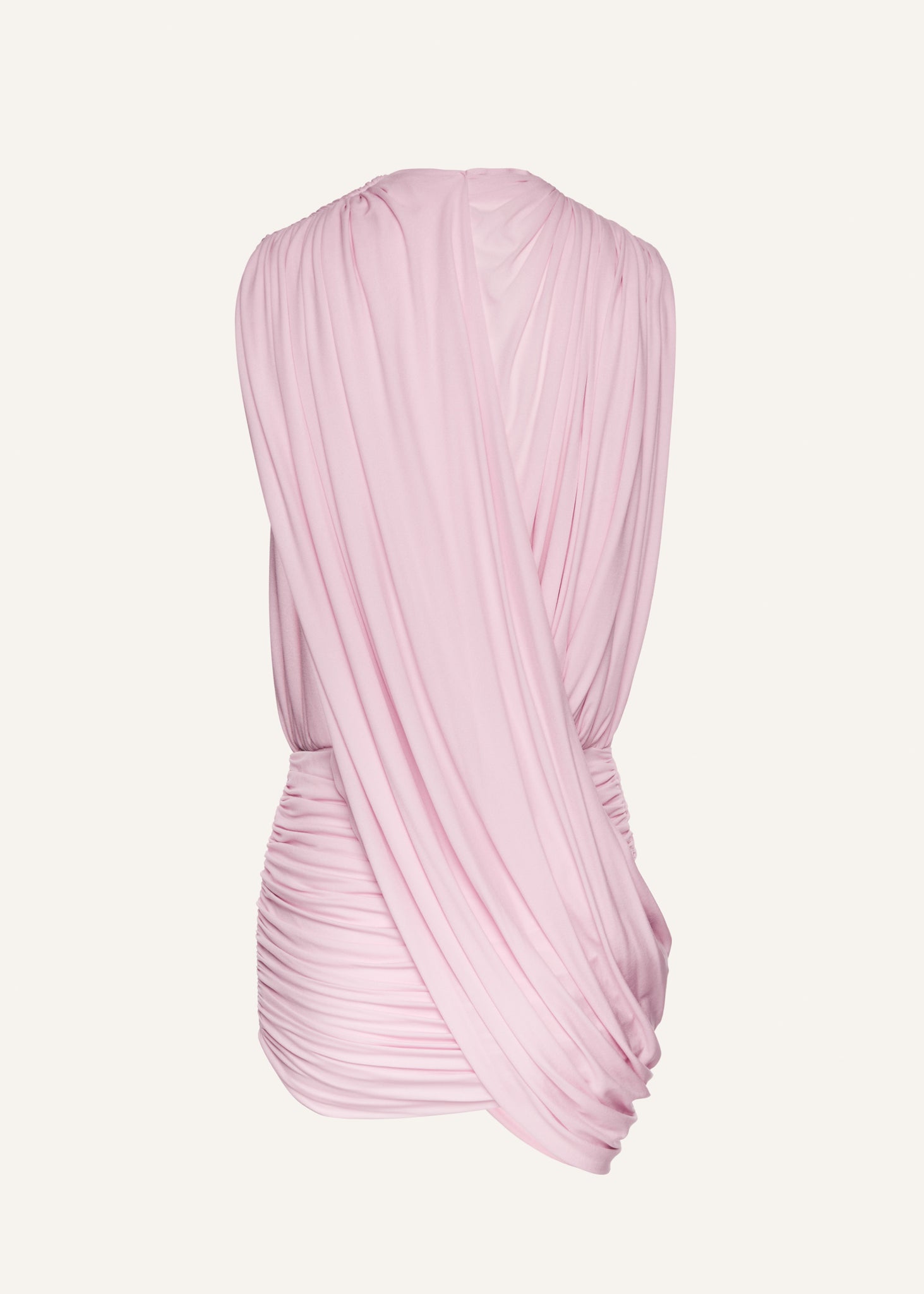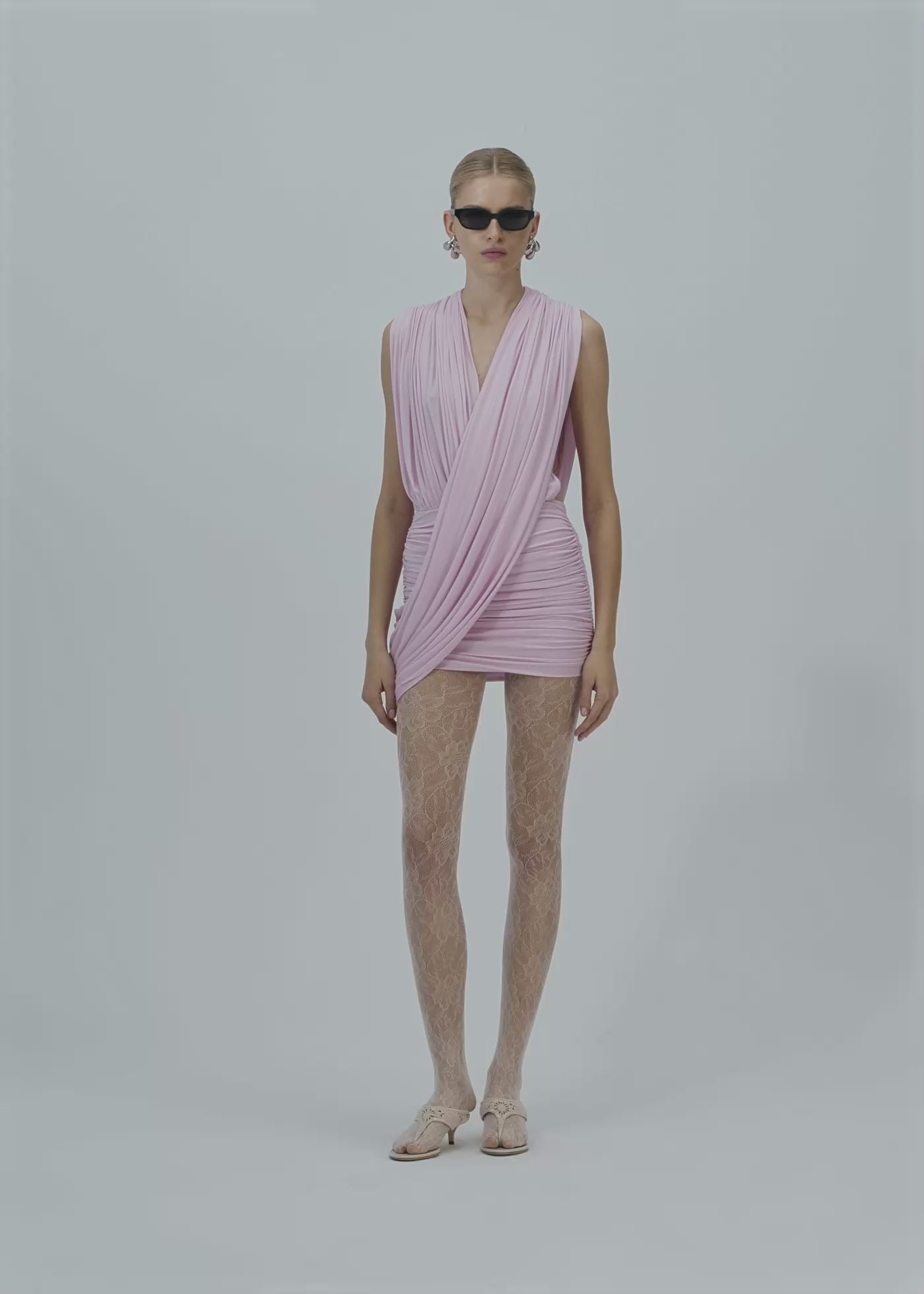 A slinky cupro mini dress with a v neck and careful draping to create a go-to going out wardrobe staple.