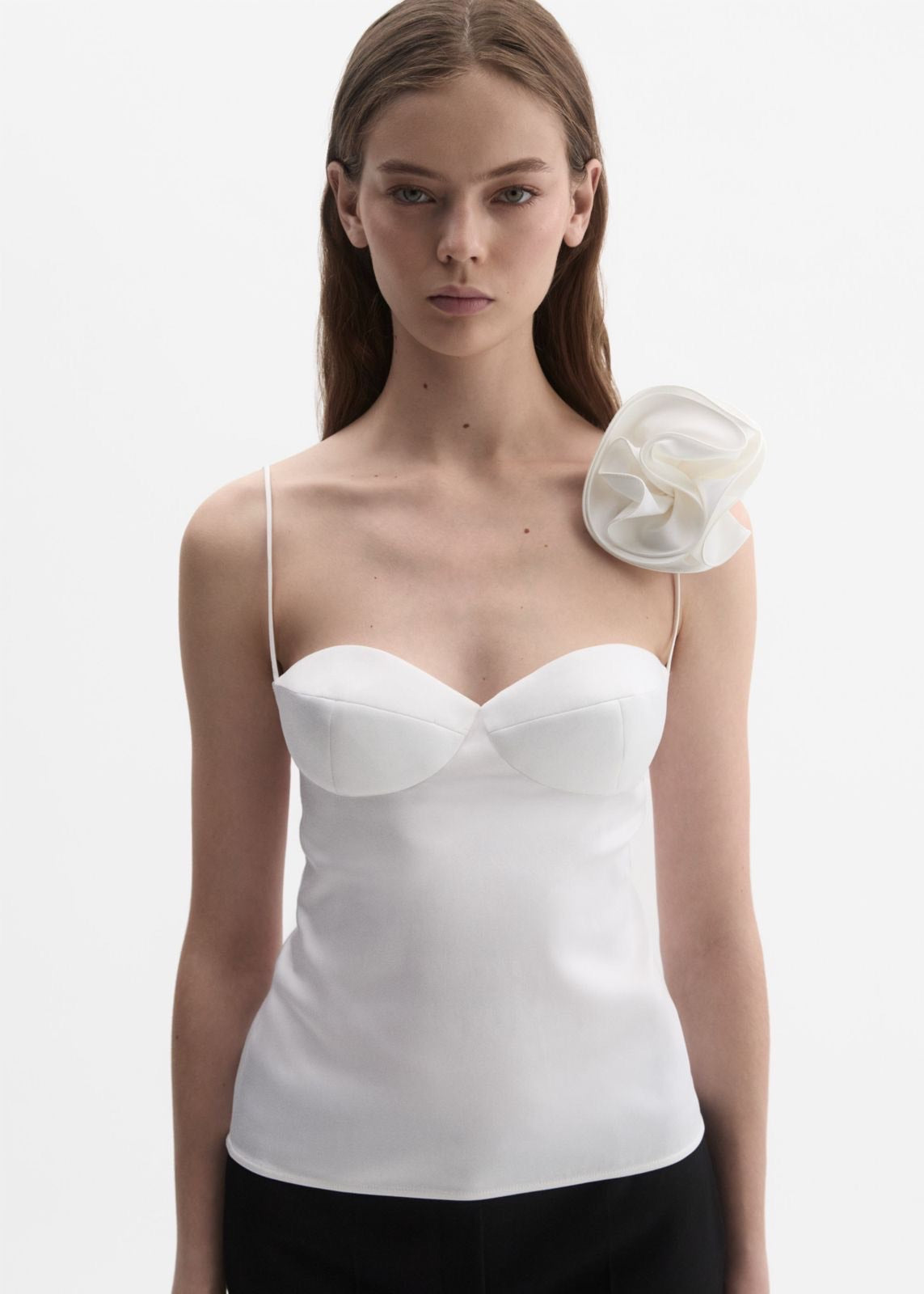 A silk tank top with spaghetti straps and a sweetheart bustier neckline, adorned with a detachable flower appliqué in classic Magda Butrym style. Available exclusively at magdabutrym.com and at the flagship boutique.
