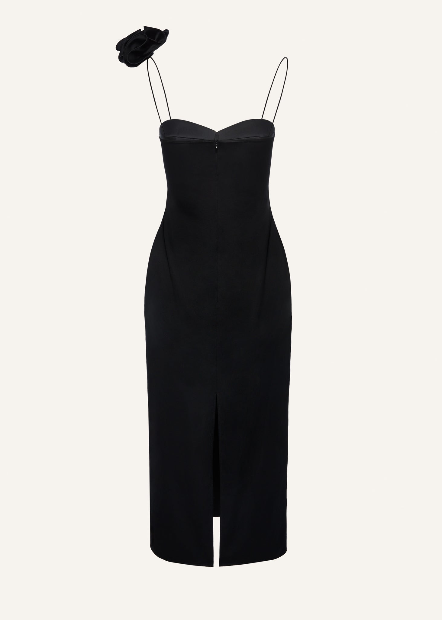 A romantic midi dress featuring a structured bustier bodice with delicate spaghetti straps and a sweetheart neckline. Cut from flowing silk in classic black, the silhouette softly skims the body and falls to a mid-length hem. A floral appliqué at the strap adds a signature Magda Butrym touch.