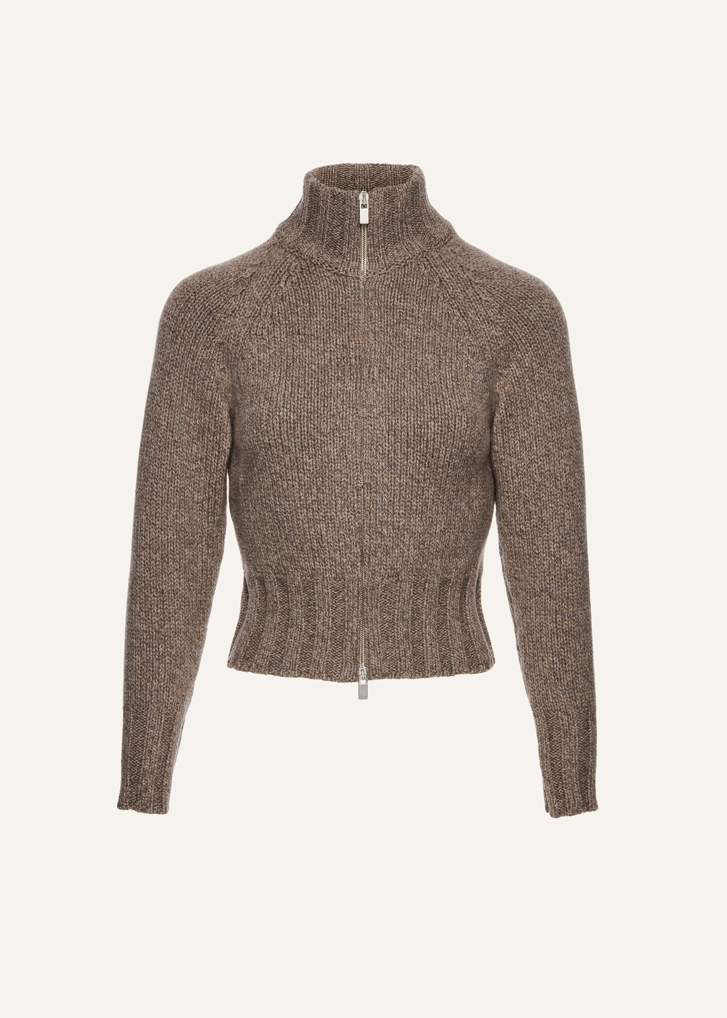 A thick marled zip up sweater with ribbed trimmings and a high-neck closure.