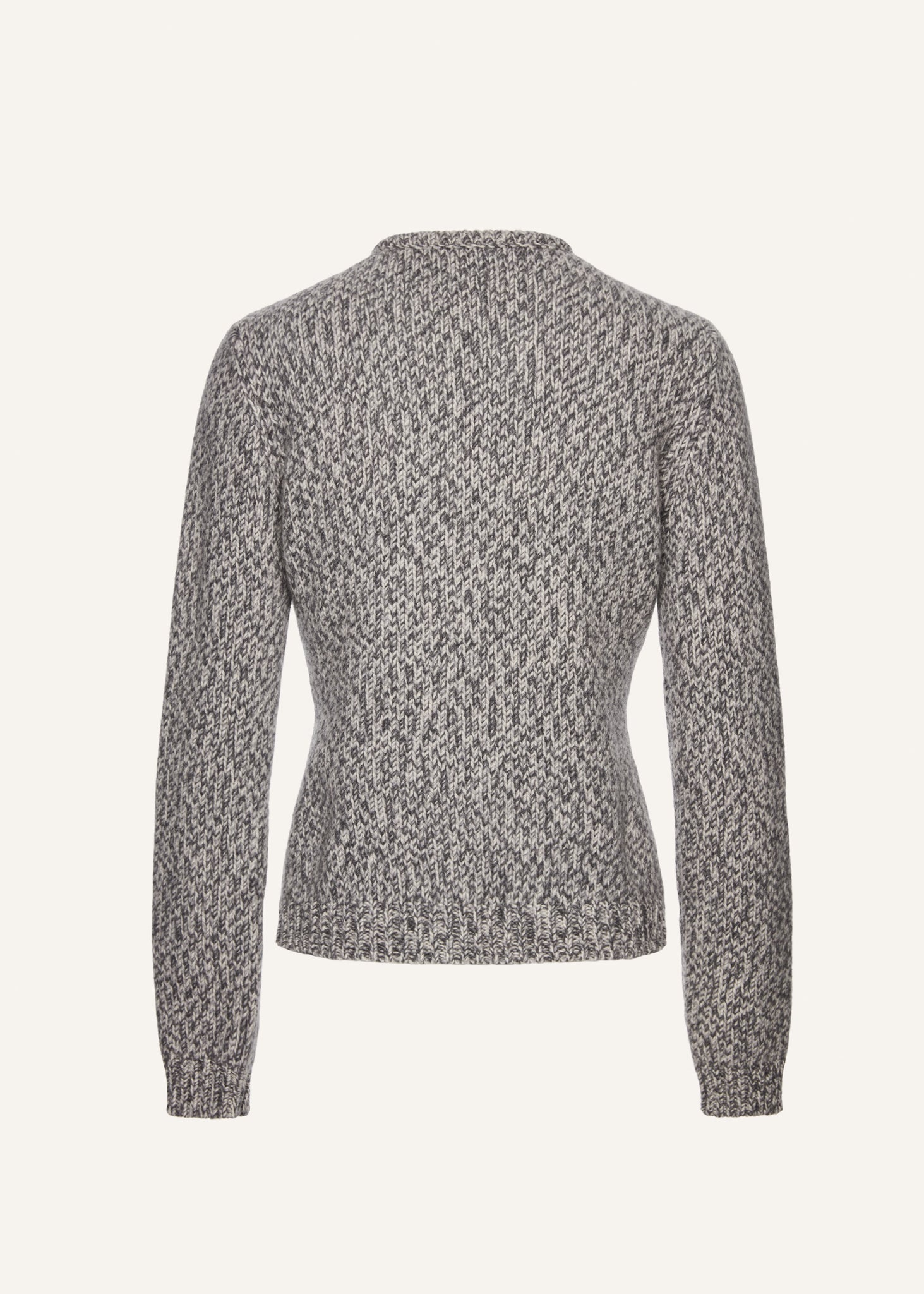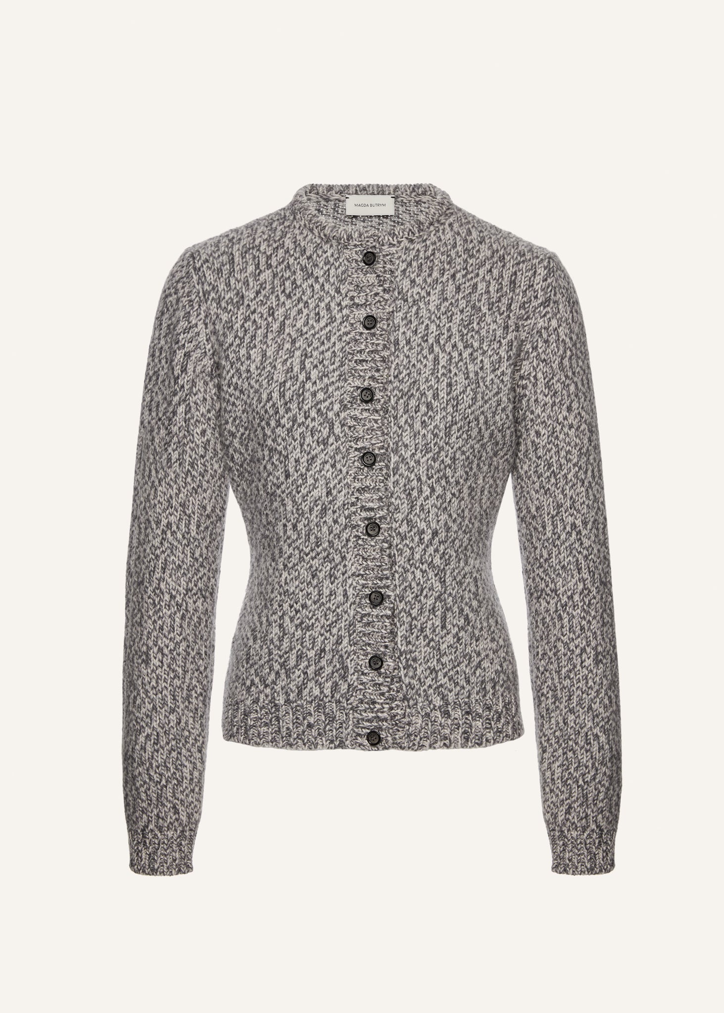 A classic round neck knit cardigan with simple buttons cut close to the body, with a thicker marled fabric.