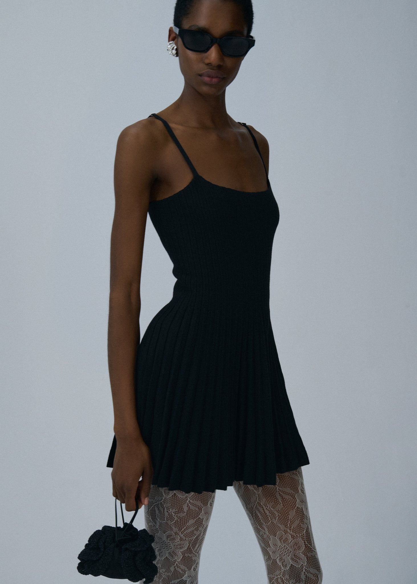 A cotton knitwear skater dress with an accordion skirt and a square neckline.