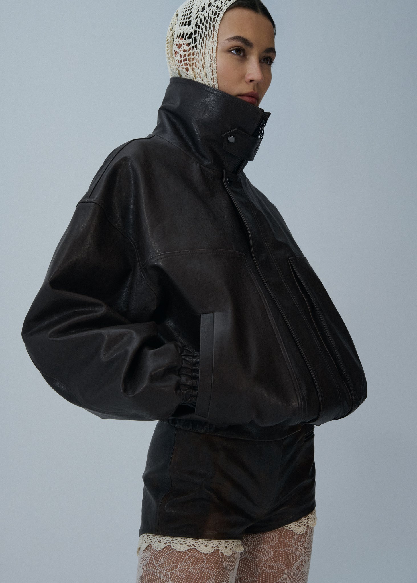 Leather mini shorts with Magda Butrym's signature handmade lace crochet trim.