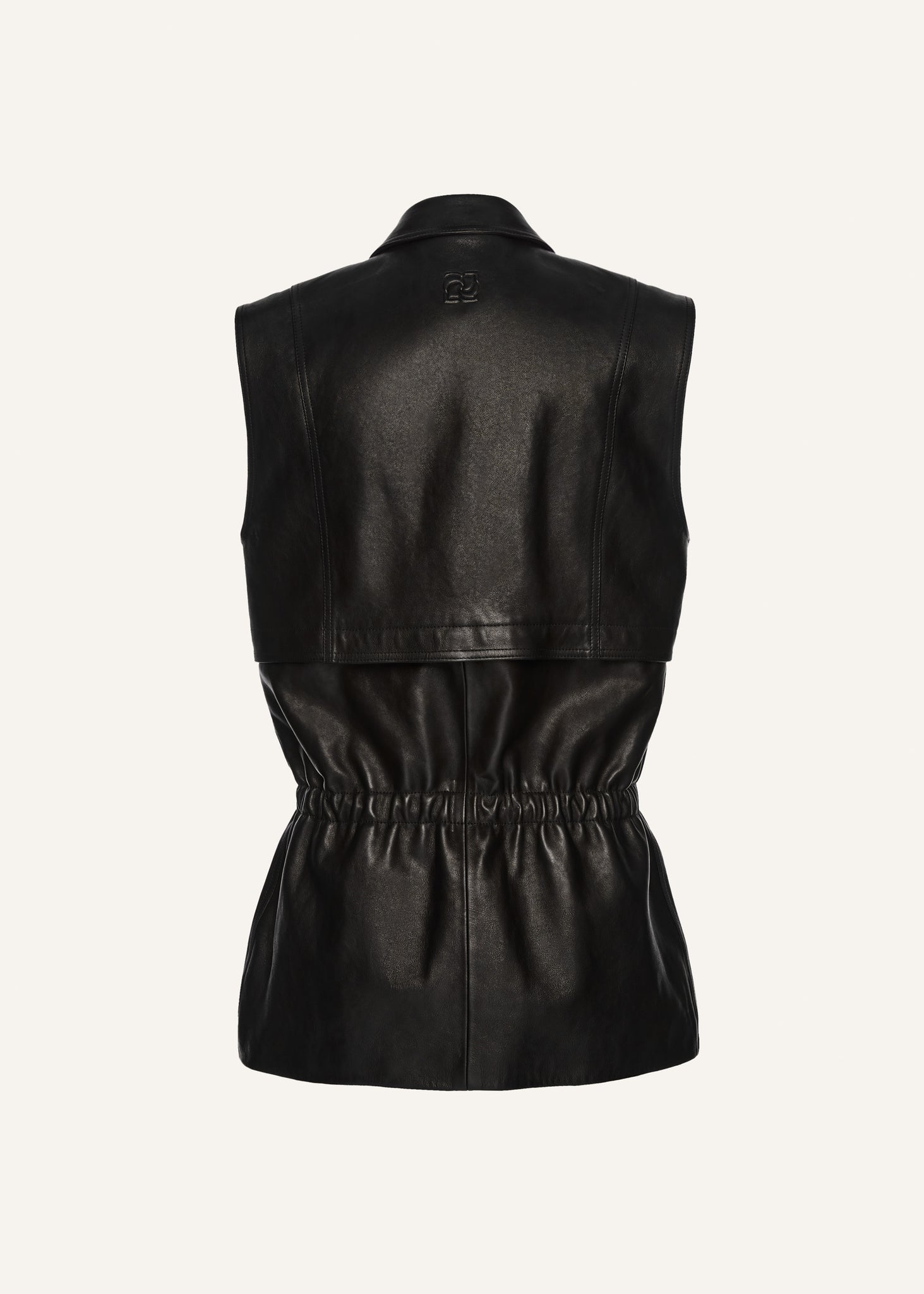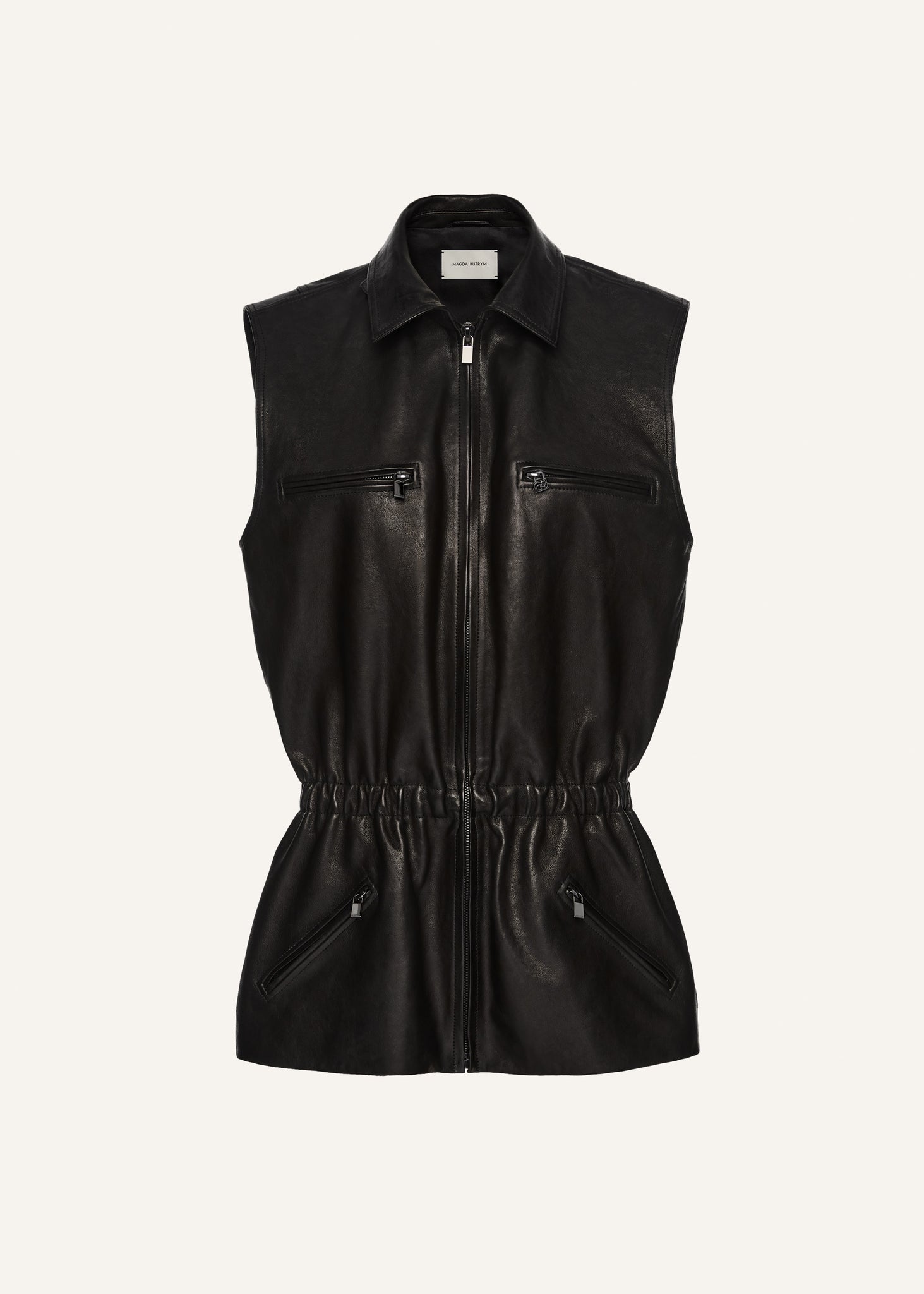 A sleeveless leather vest with a zip-front and an elasticized peplum waist.