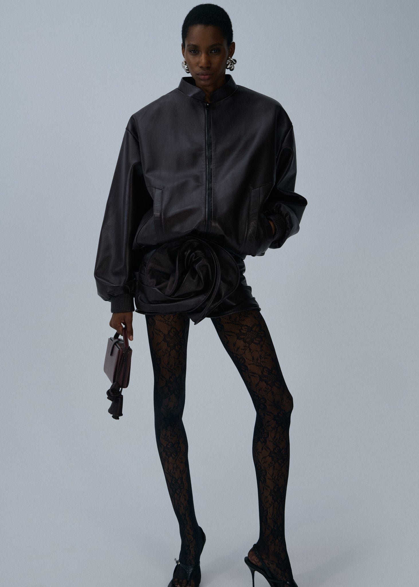 Magda updates the leather collection with a flower appliqué mini skirt. It has a button fastening in the front that gives way to the sculptural rose off-centre.