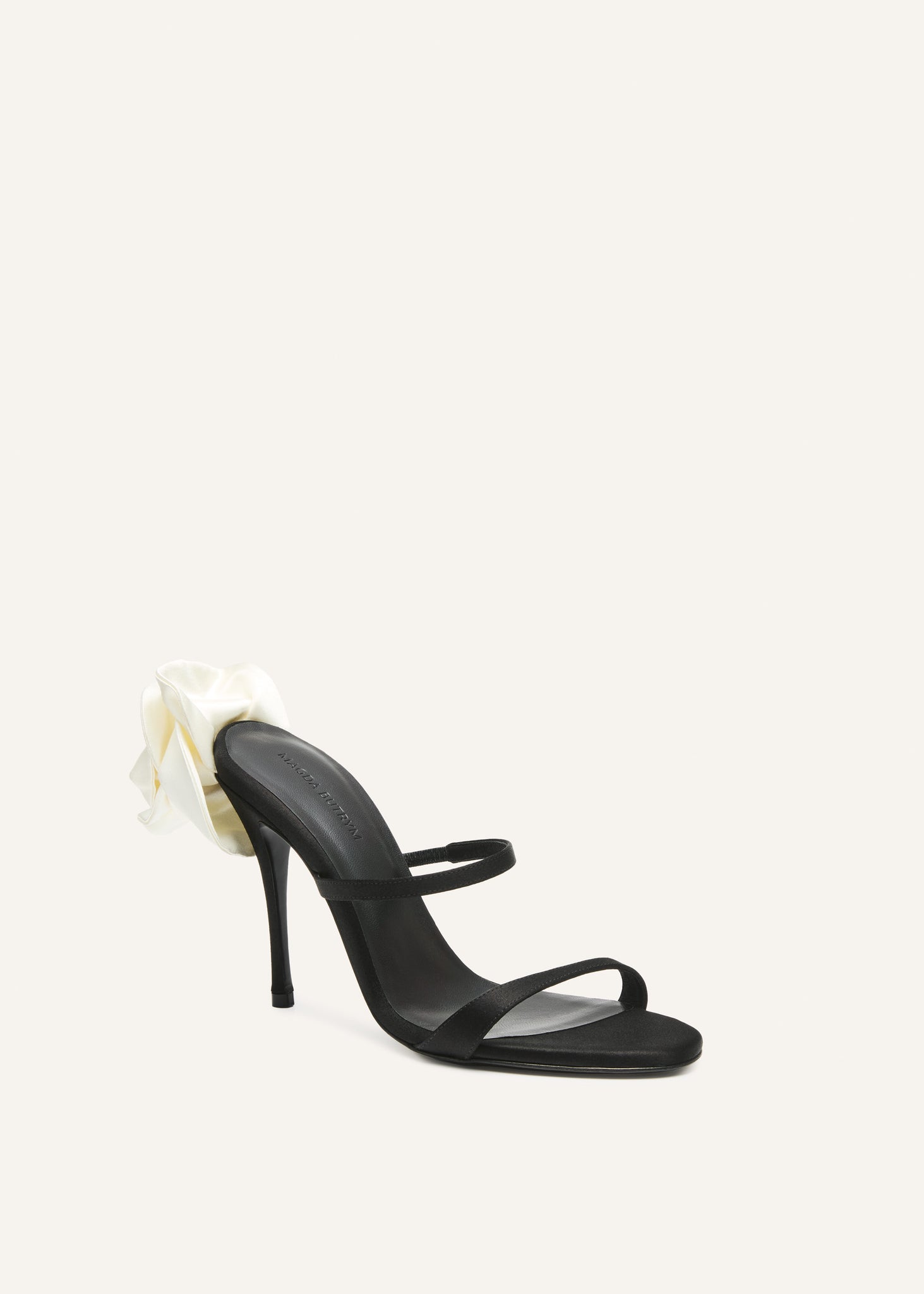 These leather sandals feature a minimal design with two slim straps across the foot and an open-toe silhouette. The standout element is the striking rose detail at the heel. The stiletto heel enhances elegance and elongates the legs.