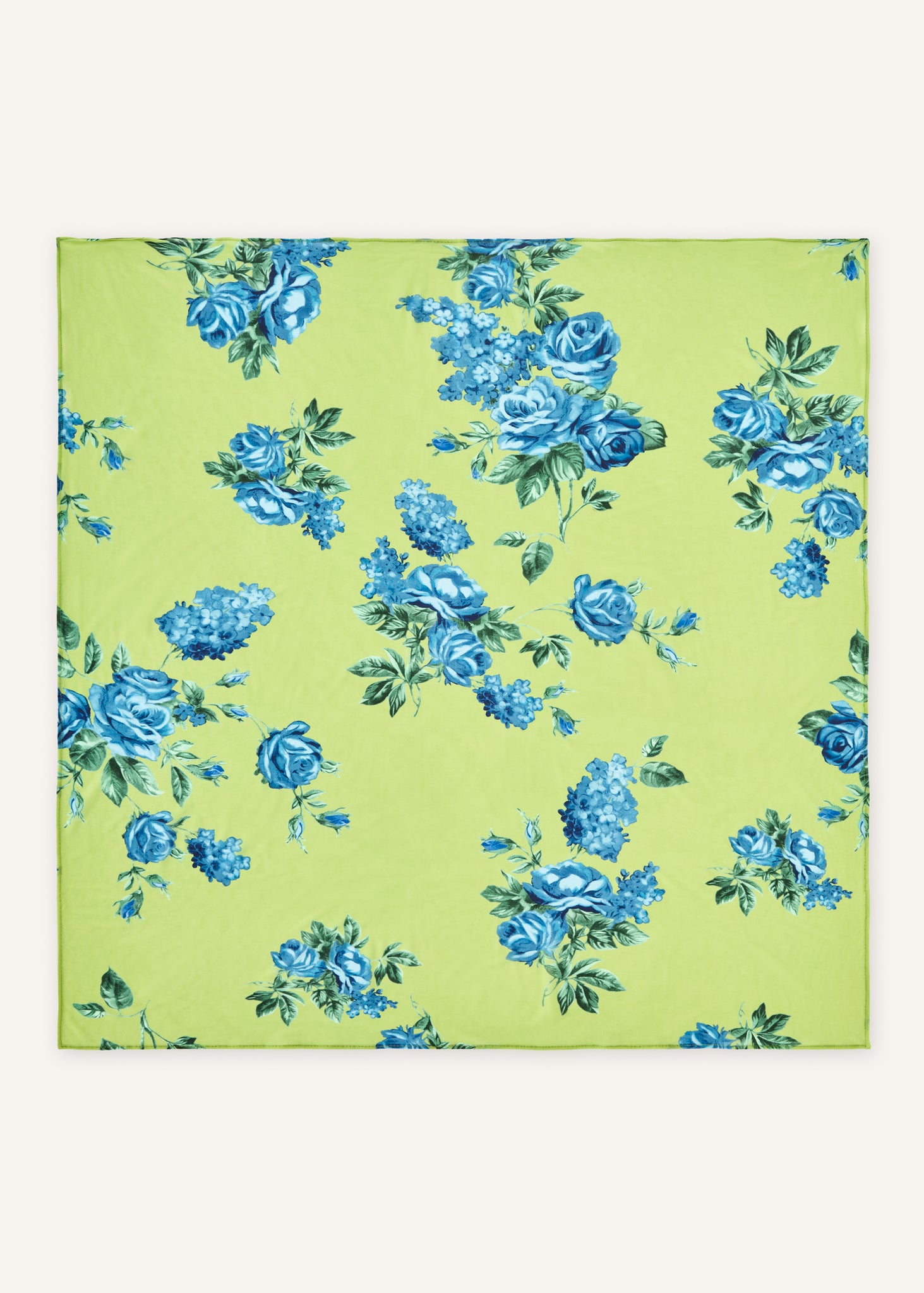 Infused with vibrant charm, the verdant silk scarf features an eye-catching green backdrop adorned with cascading blue floral motifs. The luxurious silk fabric drapes beautifully, making it a versatile accessory for tying around the neck, styling as a headscarf, or accenting your favorite handbag. This statement piece effortlessly combines elegance with a fresh, botanical aesthetic—perfect for adding a pop of color to any ensemble.
