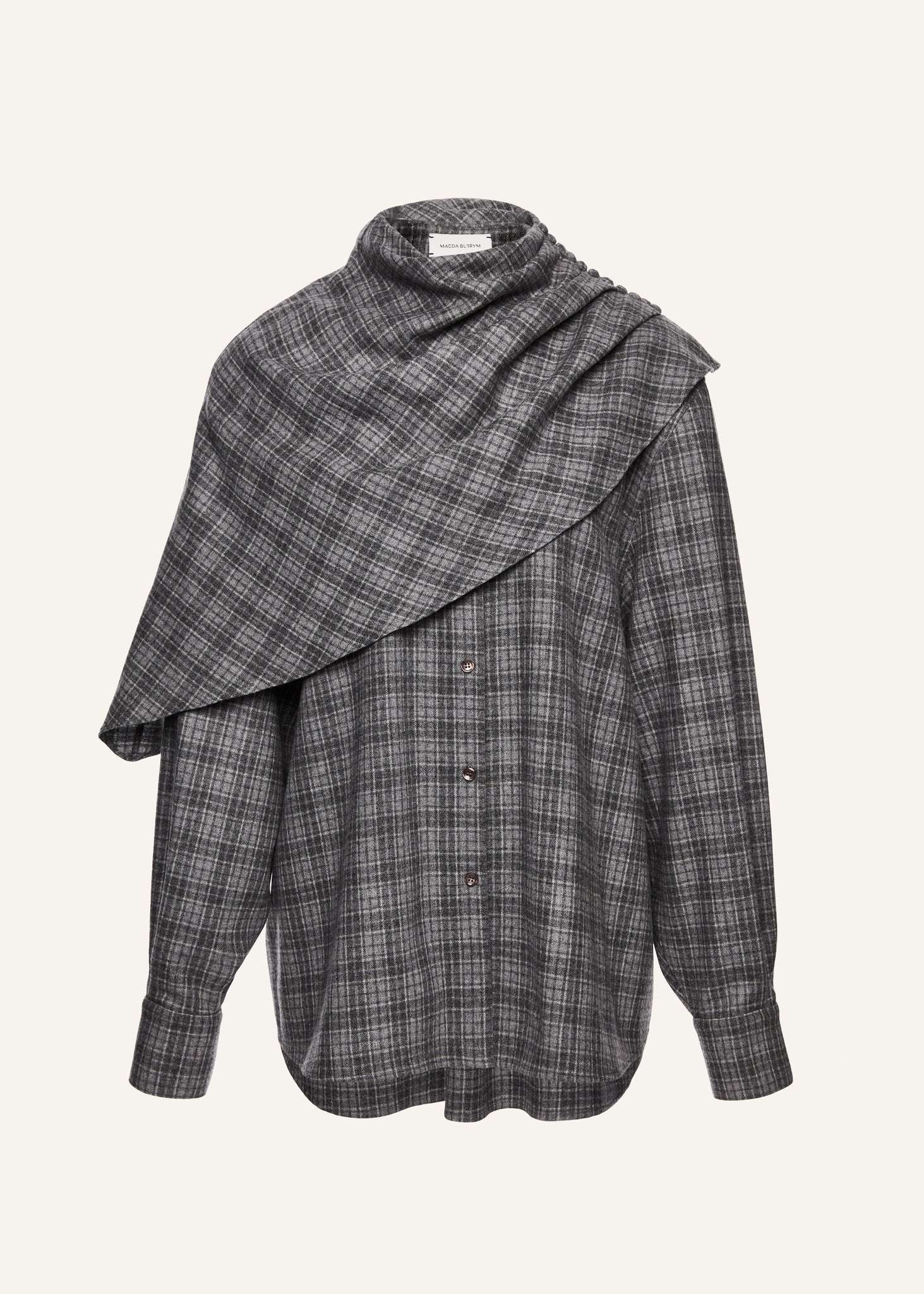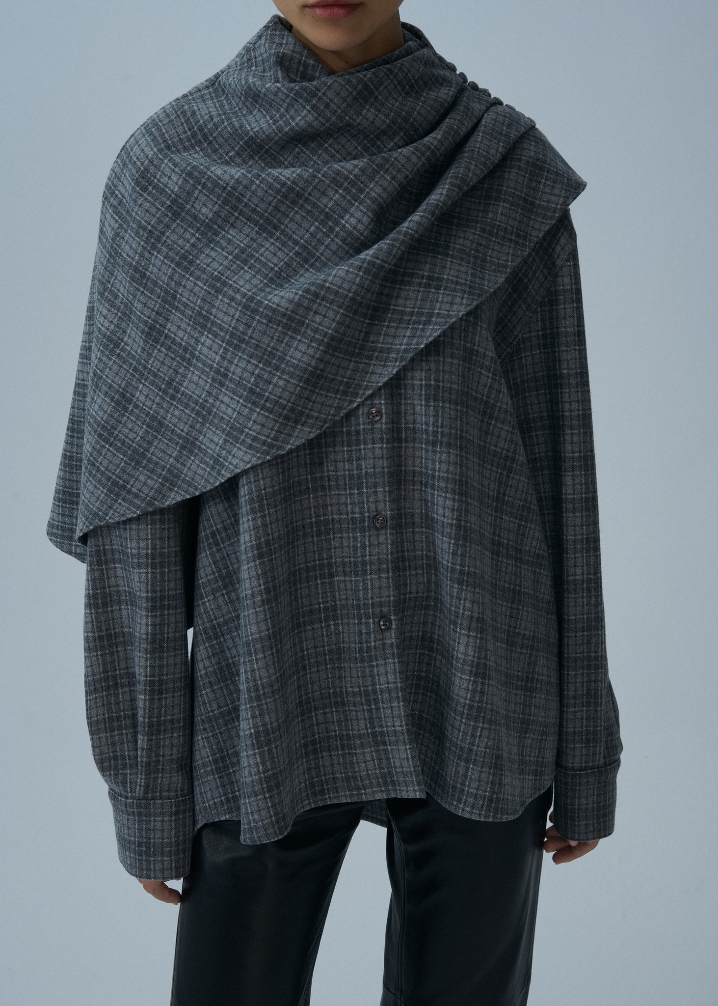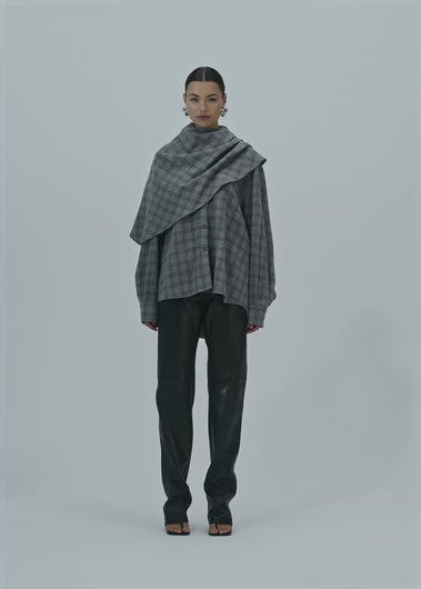 A classic oversized button-down collared shirt that can be worn with or without the cape. The pull-over style layer has a striking asymmetrical cut. Made from a wool and cashmere blend.