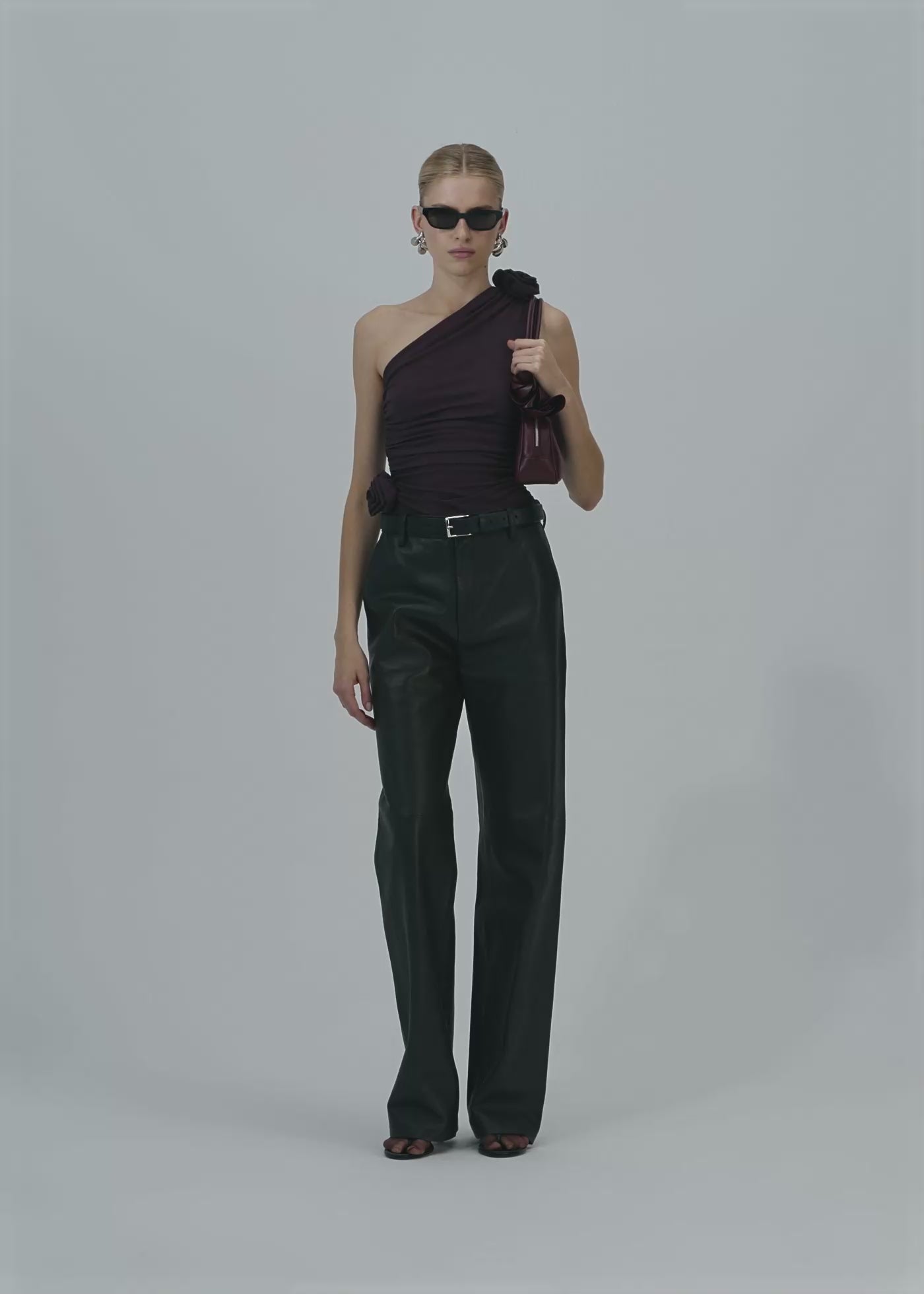 Magda reinvisions the classic t-shirt in a totally modern way: a lightweight one-shoulder asymmetrical top with ruched detailing and 3D cotton roses.