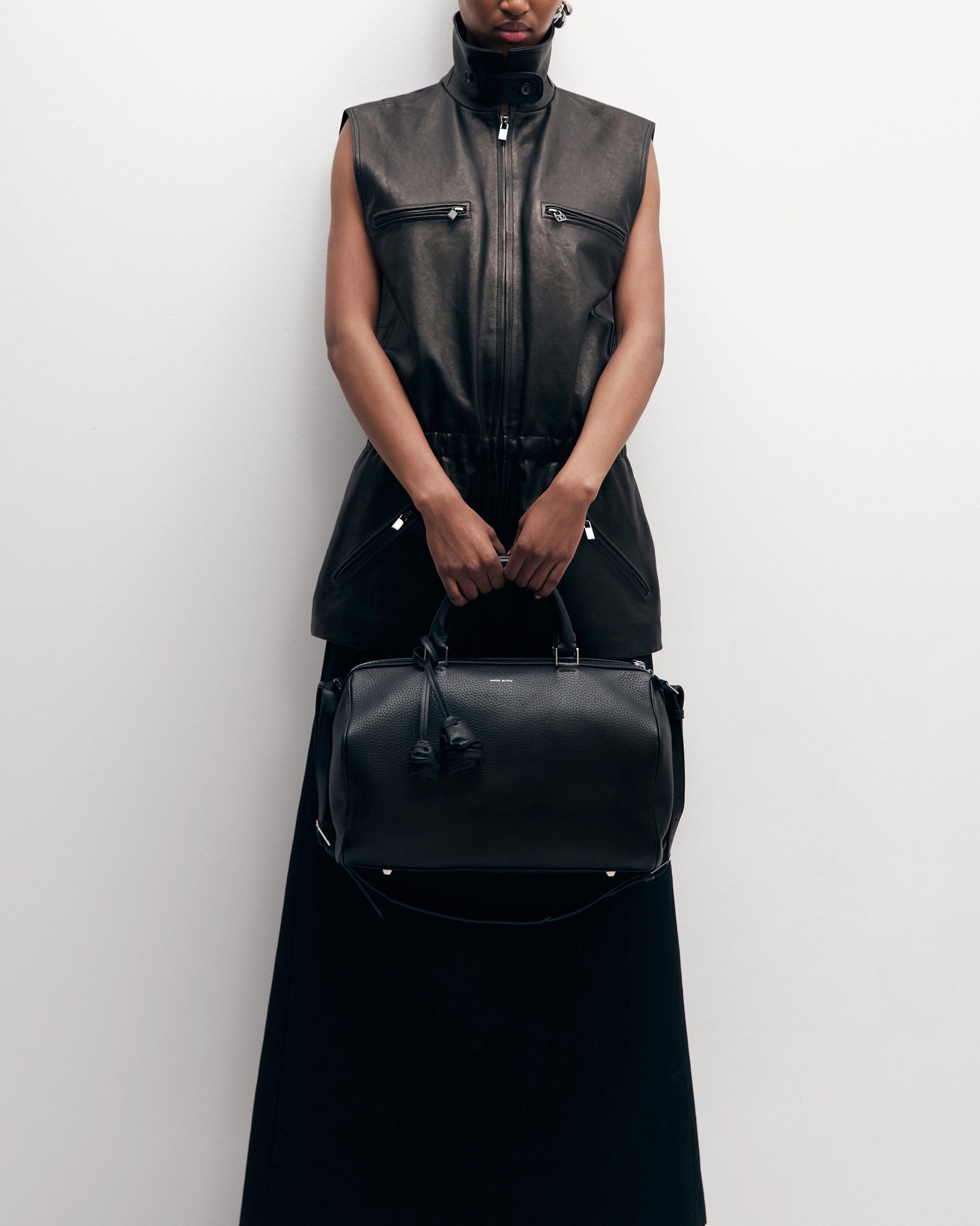 A tribute to Magda Butrym’s roots in Warsaw, the Varsovia bag is a timeless blend of elegance and versatility. This design features a structured silhouette with both top handles and a detachable crossbody strap. Crafted with meticulous attention to detail, its leather exterior is complemented by a detachable flower charm, adding a signature touch of femininity. Perfect for carrying essentials, the Varsovia bag is a statement of timeless elegance, accompanying you effortlessly as you stride through the city. Available in various leather finishes and colors.