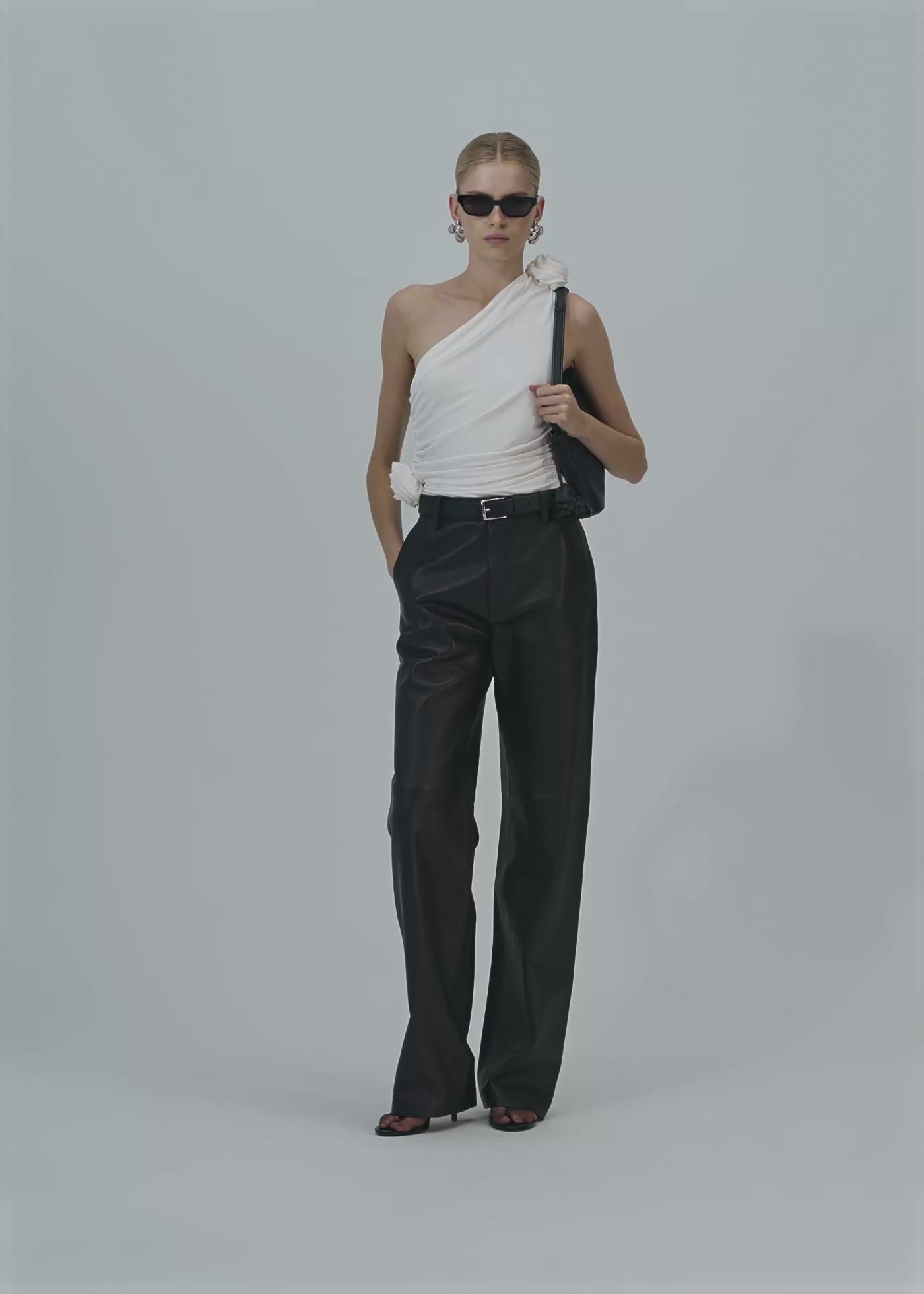 Magda reinvisions the classic tshirt in a totally modern way: a lightweight one shoulder asymmetrical top with ruched detailing and 3D cotton roses.
