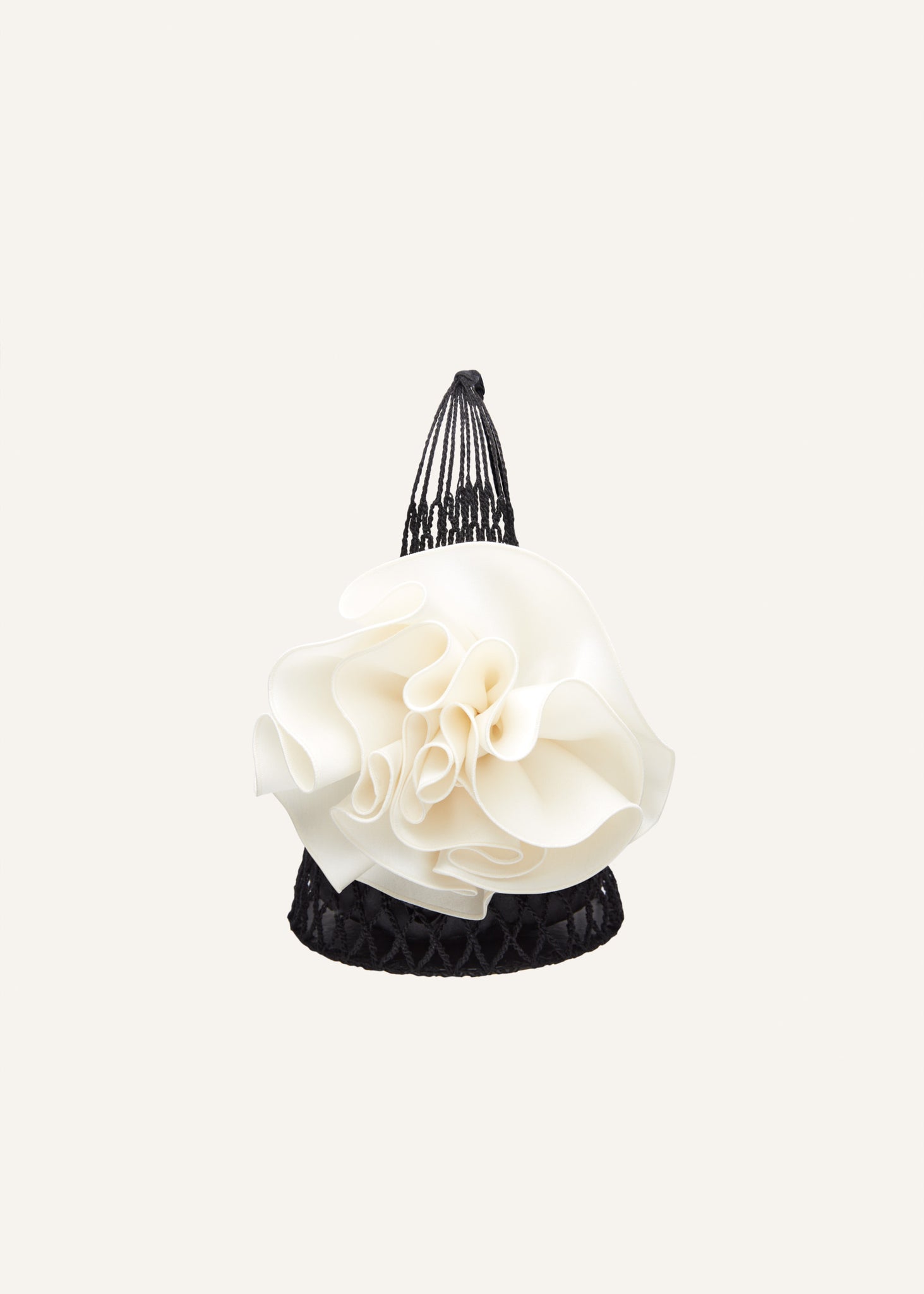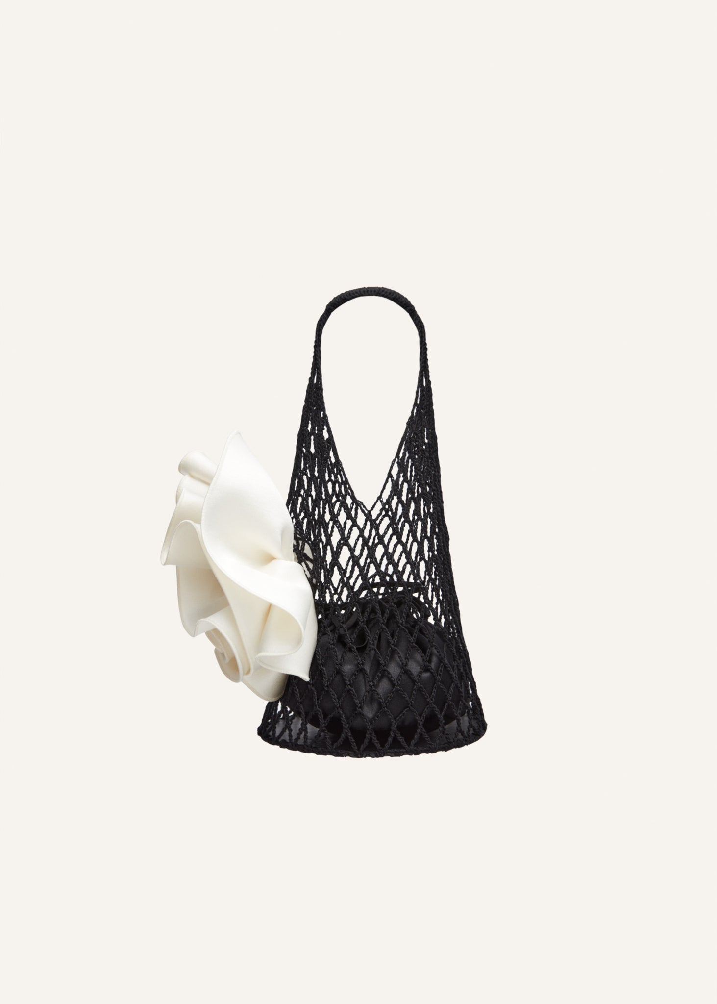 The Devana bag is a tote bag made from large netted crochet using natural fibers, creating the perfect bag for summer. A large satin flower adorns the front of the bag. Small size.