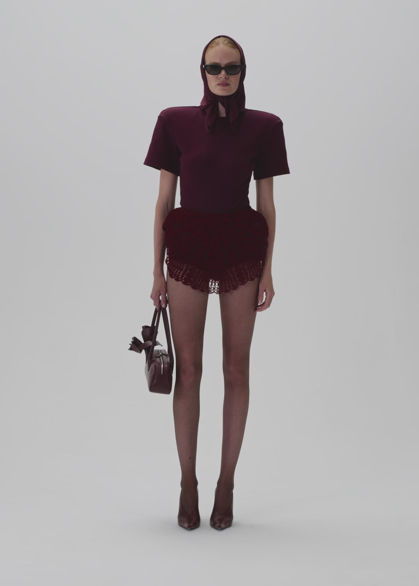 Magda's signature bodysuit features removable padded shoulders, short sleeves, and a fitted body to create her signature silhouette. Ribbed fabric and a round neckline complete the look.