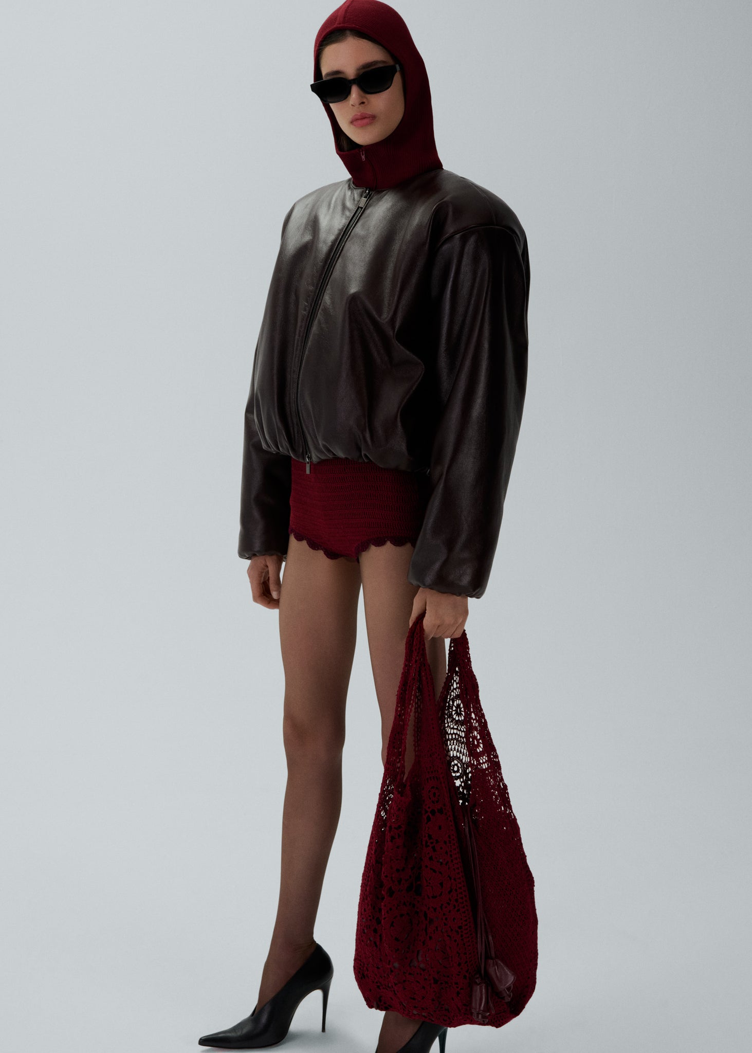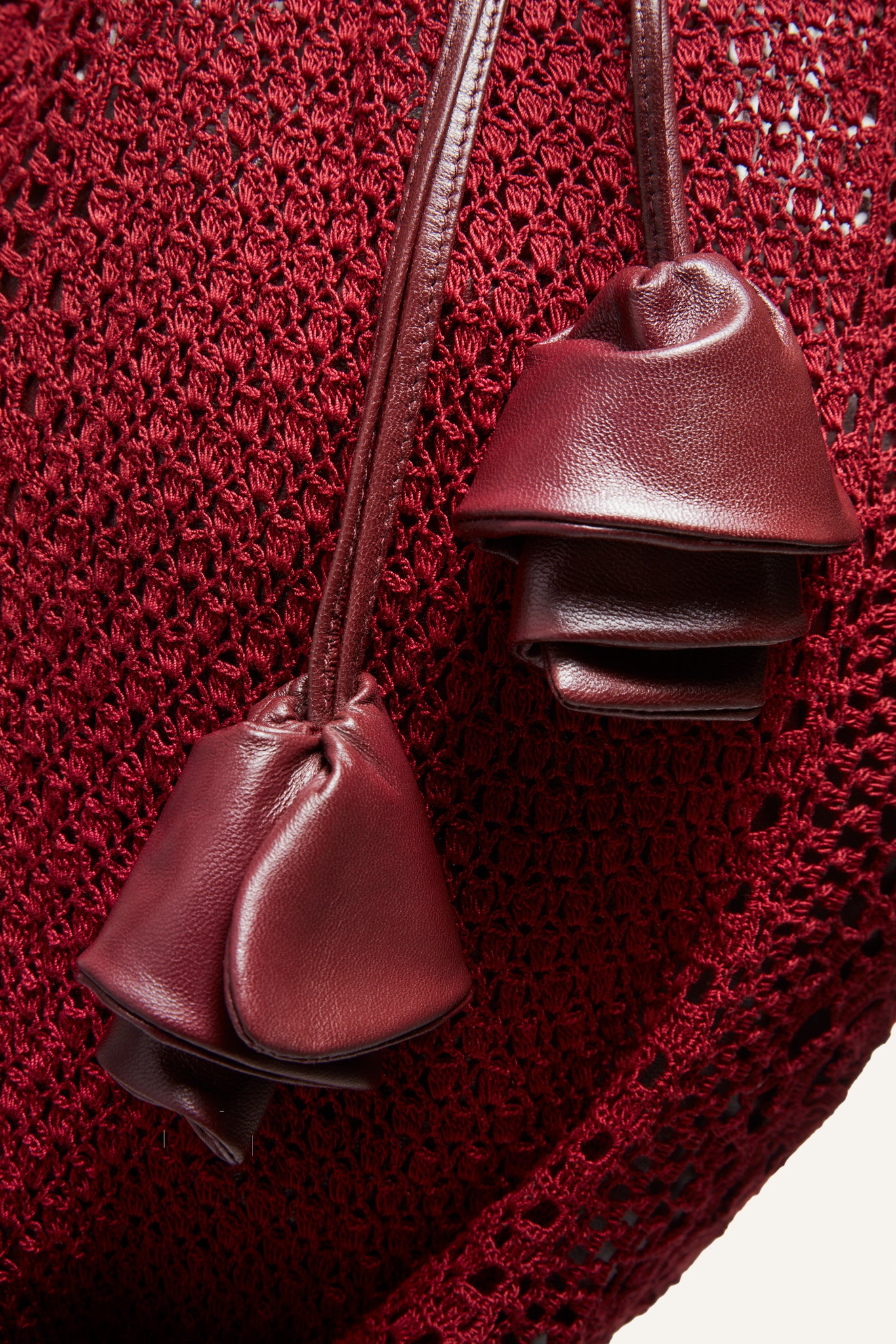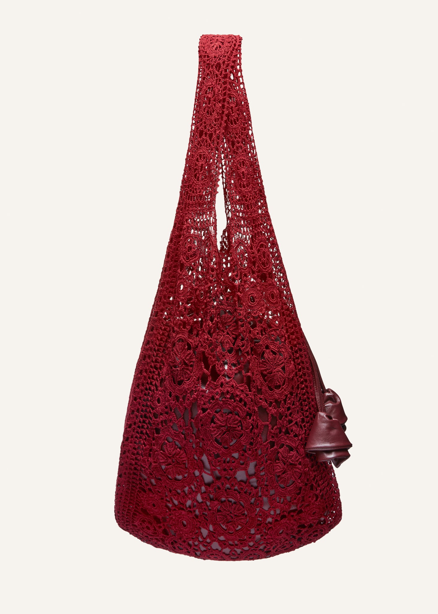 A handmade crochet tote bag in burgundy, designed with a rectangular shape, two handles, and a leather inner bucket, created using traditional Polish Koniaków lace techniques for artisanal elegance.