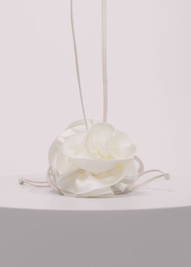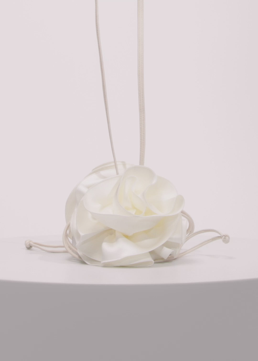 The Magda bag is a mini bucket bag made from satin, adorned with large 3D fabric flowers across the body. Made from satin, these flowers add a signature element of Magda DNA.