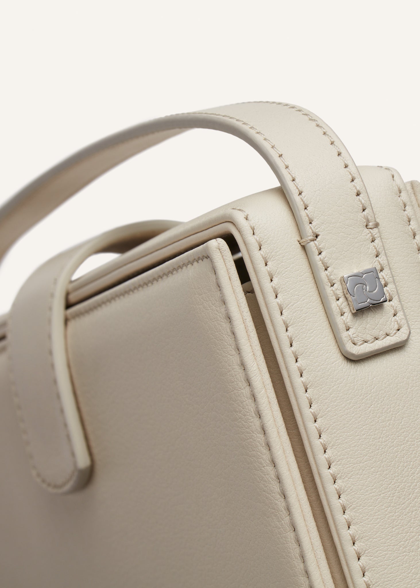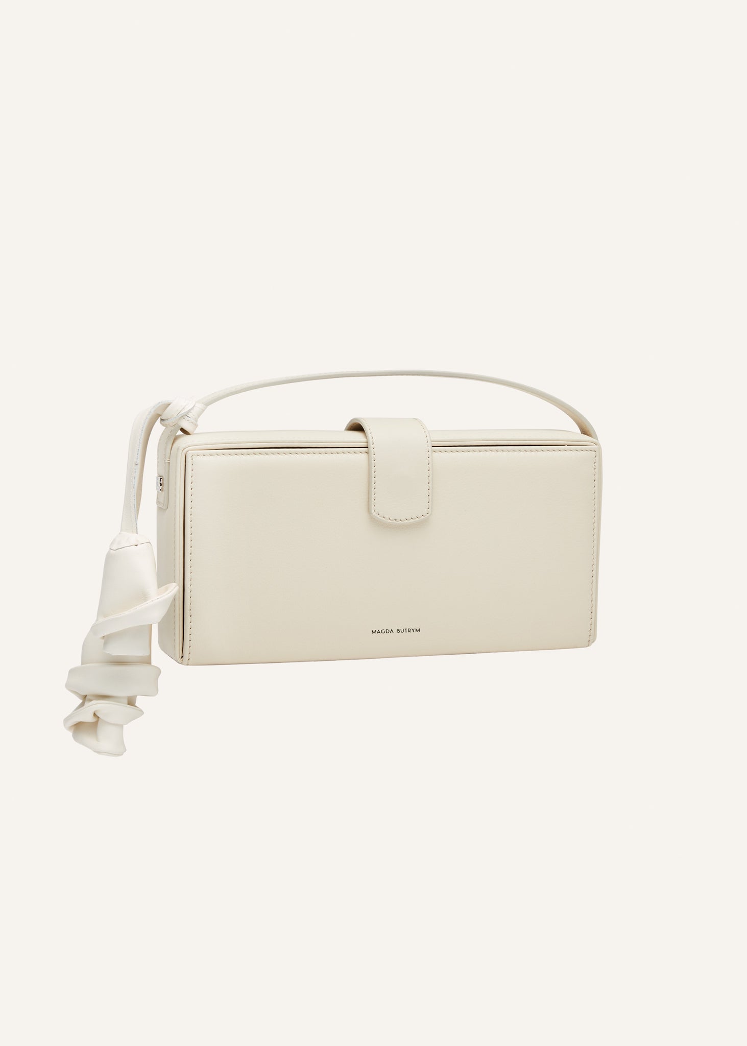 Magda's Apolonia bag is a chic pochette with a box design and simple strap, characterized by its timeless and minimal design. On the inside of the bag is a very special hand painted rose. The bag is made recognizably Magda with its detachable flower charm at handle.