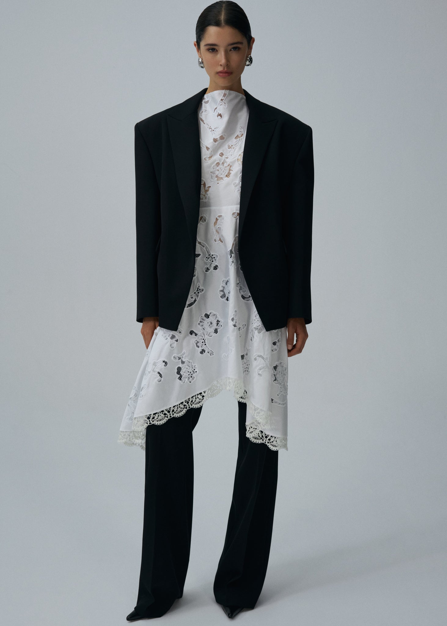 An extra oversized blazer made from wool with classic lapels and two front pockets, free from button closures, cut for a cool and modern fit.