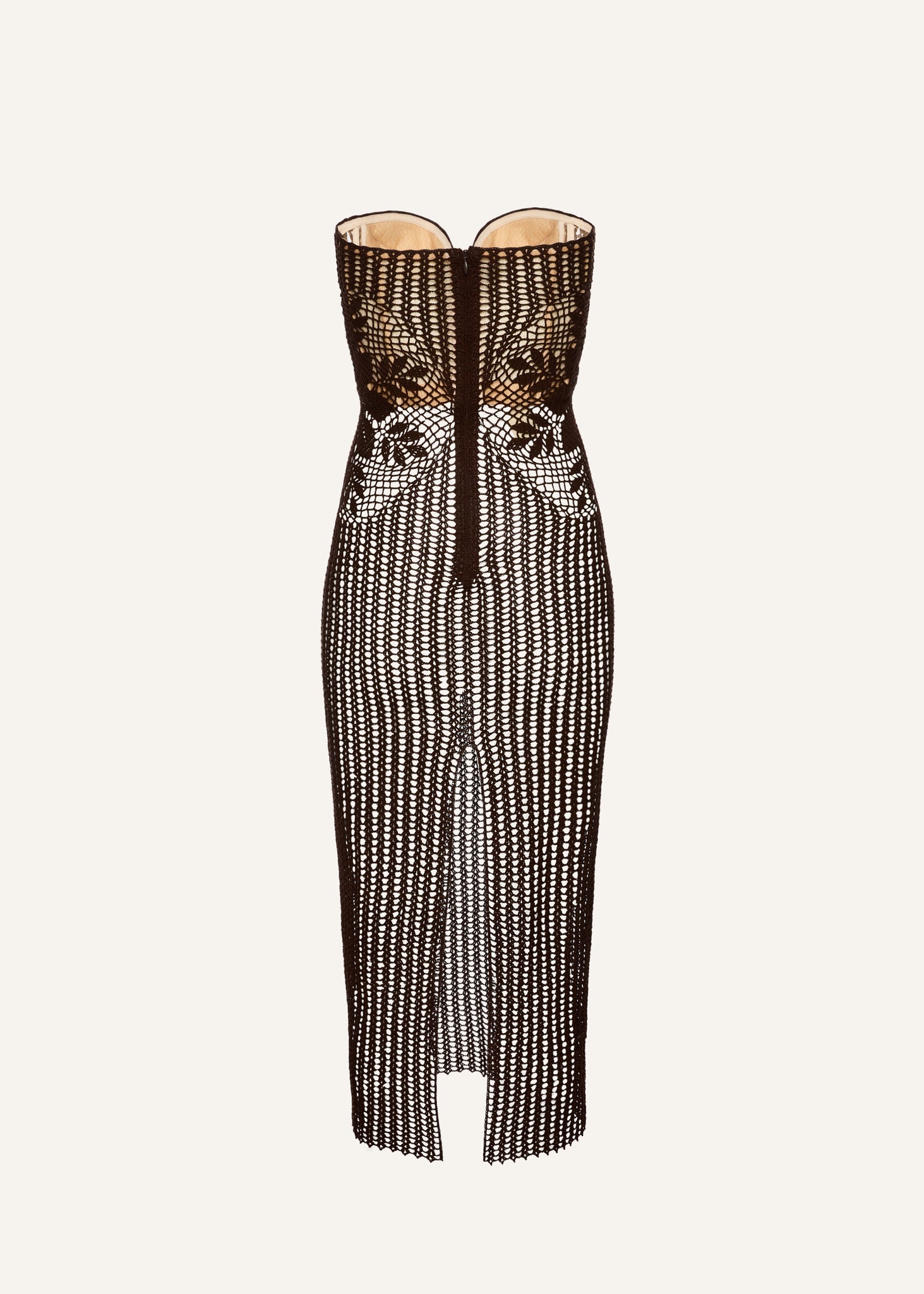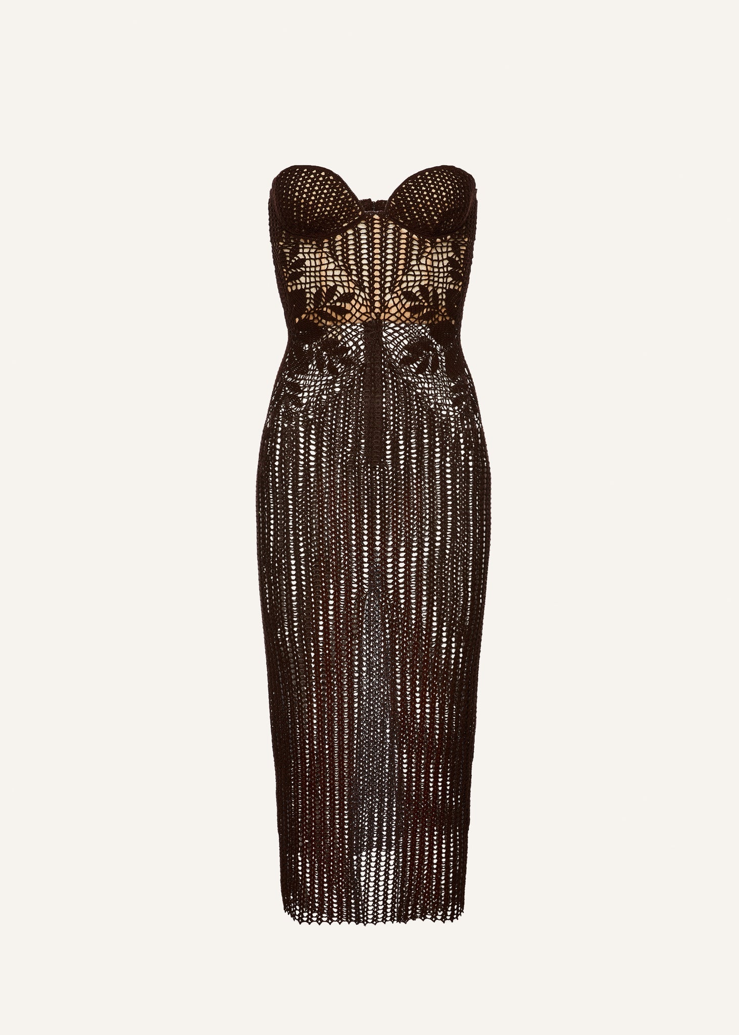 Handmade in Poland, this special dress is made entirely from intricate crochet techniques to create a lace pattern, with an inner corset to create a feminine shape and signature rounded bustier cups.