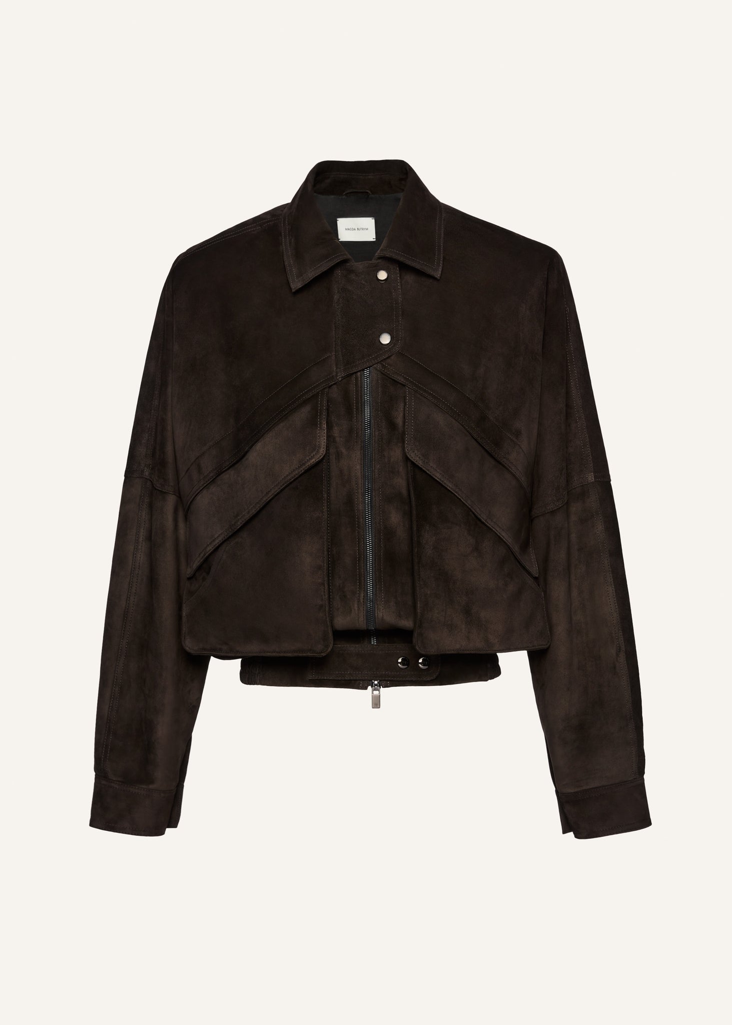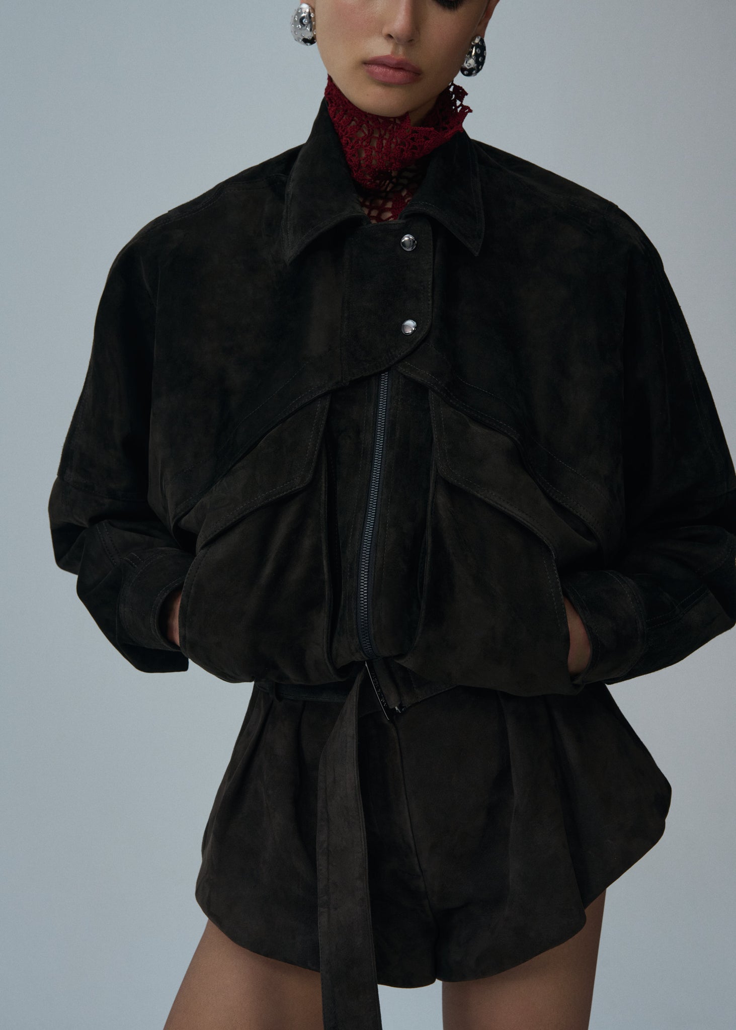 An oversized jacket made from leather, with a distinctly vintage feel. The bomber shape of the jacket offers sloping shoulders, a cinched elastic waistband, zip and button closures, and oversized front flap pockets.