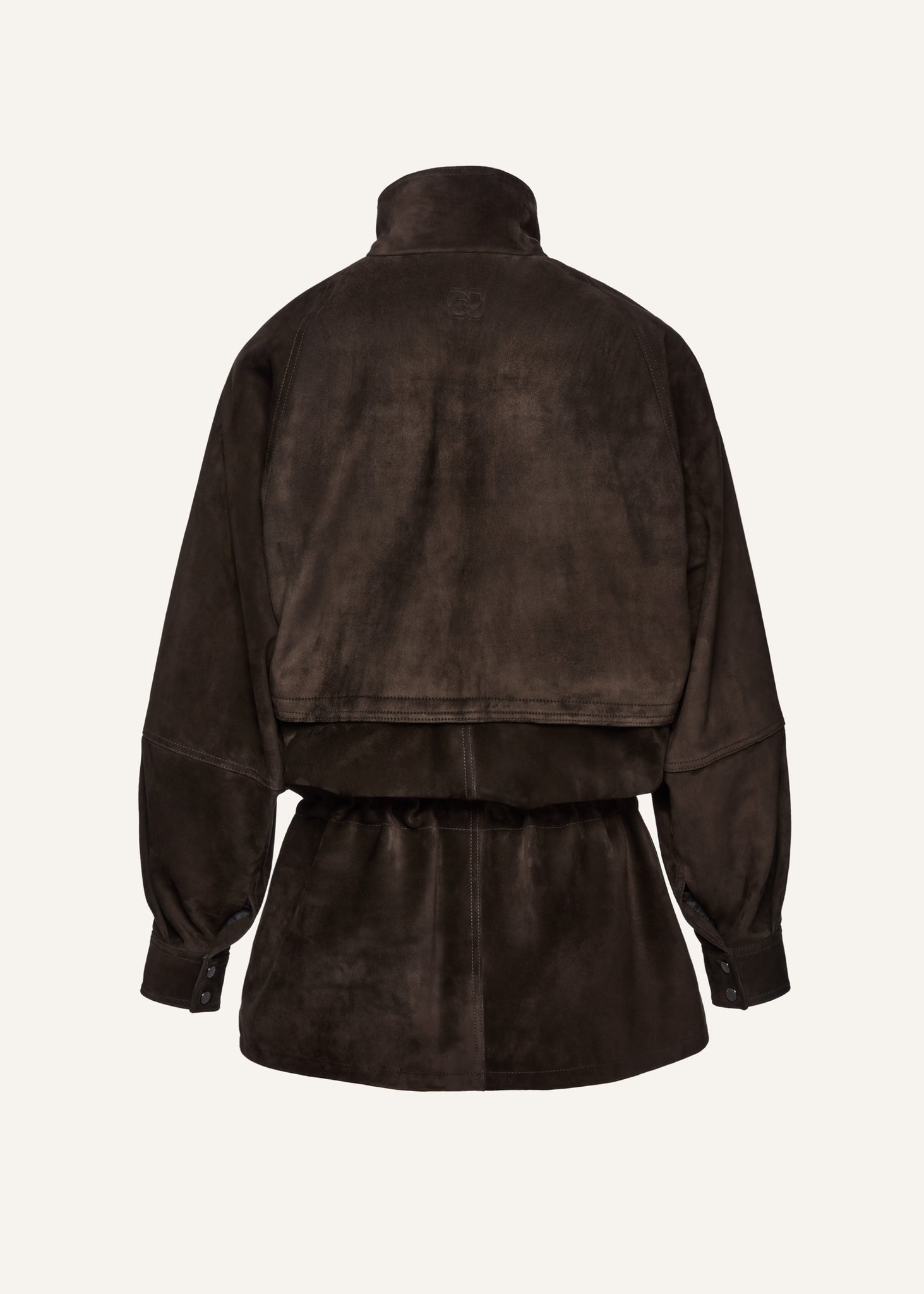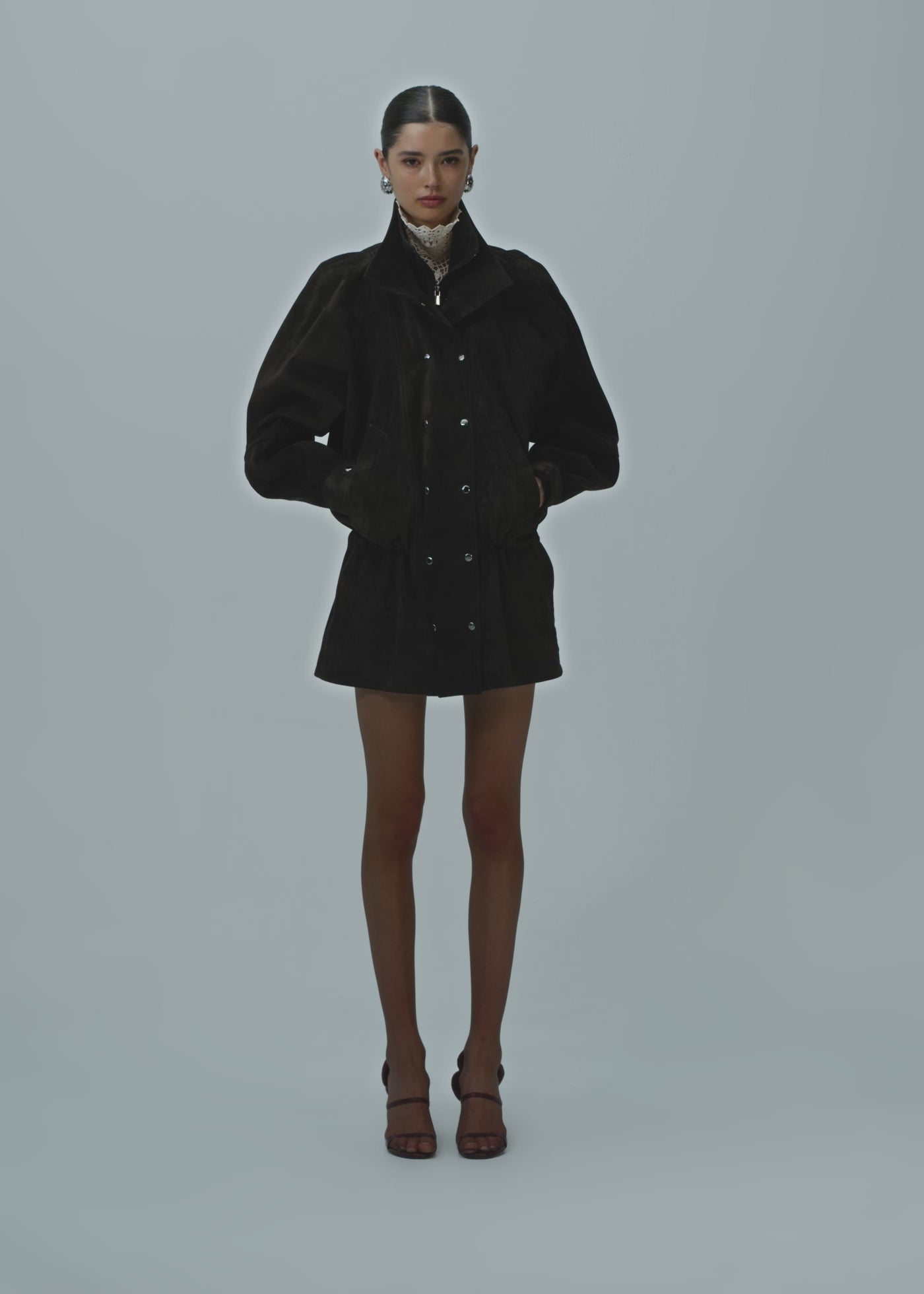 A longline jacket, cut from supple suede, with a cinched waist for a peplum effect. The jacket features a double snap button closure and a foldable high neck.