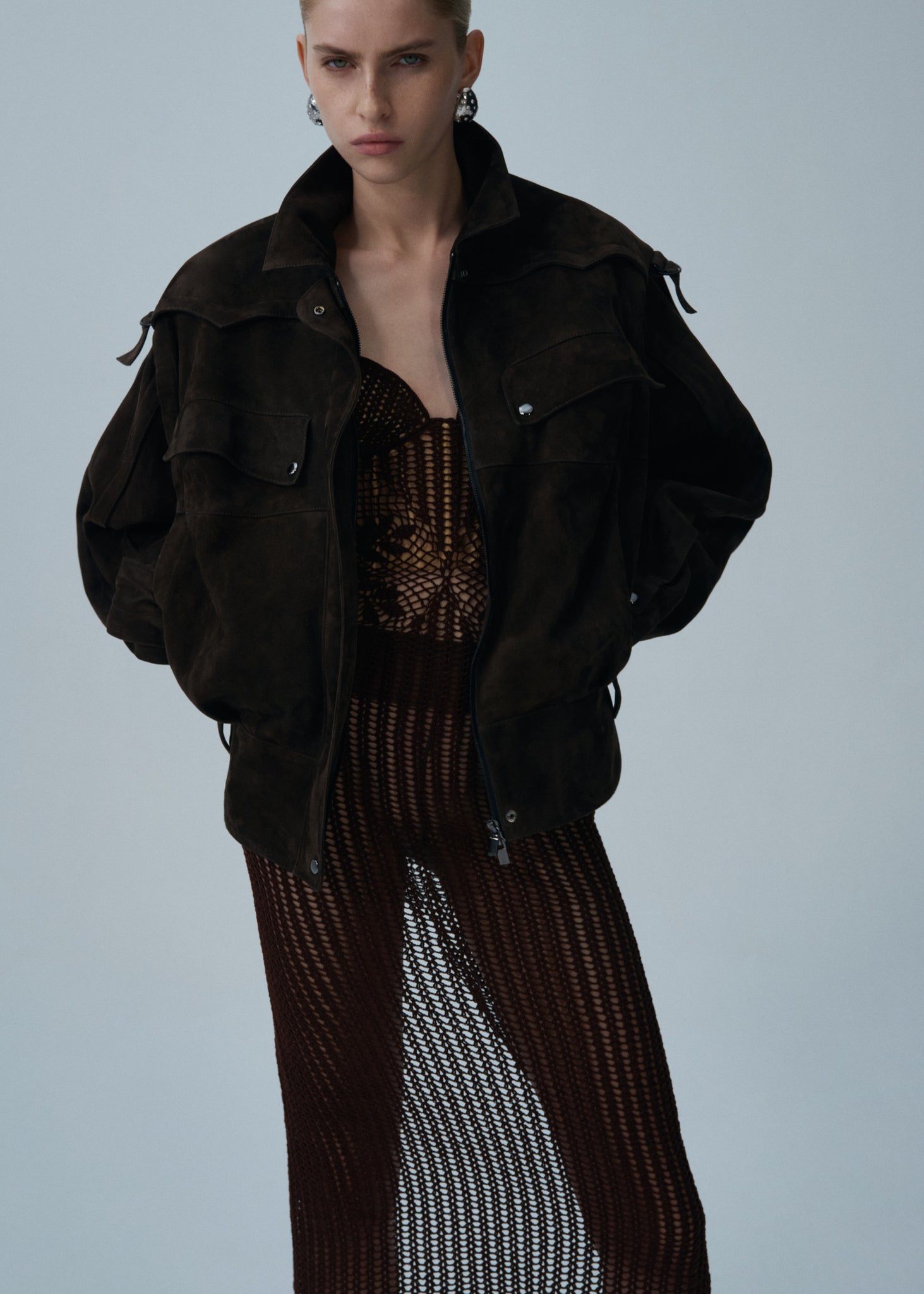 This cargo jacket is made from rich, soft brown suede, offering a luxurious take on utilitarian style. The jacket features large flap pockets, snap closures, and adjustable drawstring details on the sleeves and waist for a customizable fit. It's a versatile layering piece, perfect for adding a statement to any outfit, whether casual or dressed up.