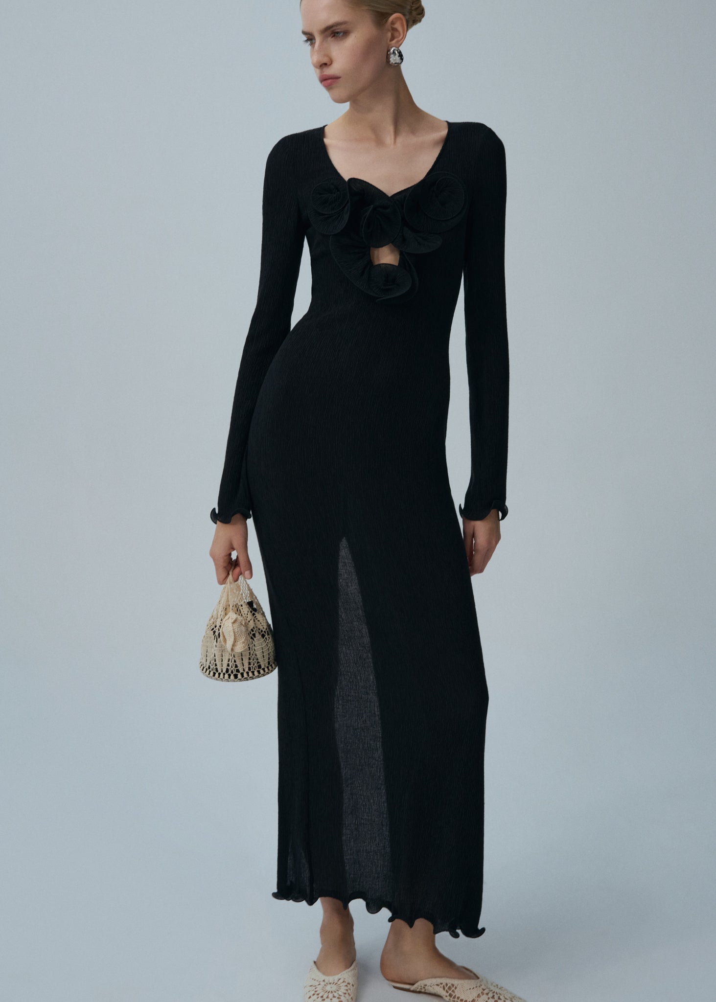 This hand-crocheted cream Devana is crafted with delicate detail and features a soft satin pouch inside. A subtle crochet flower adorns the handle, adding a touch of charm. .