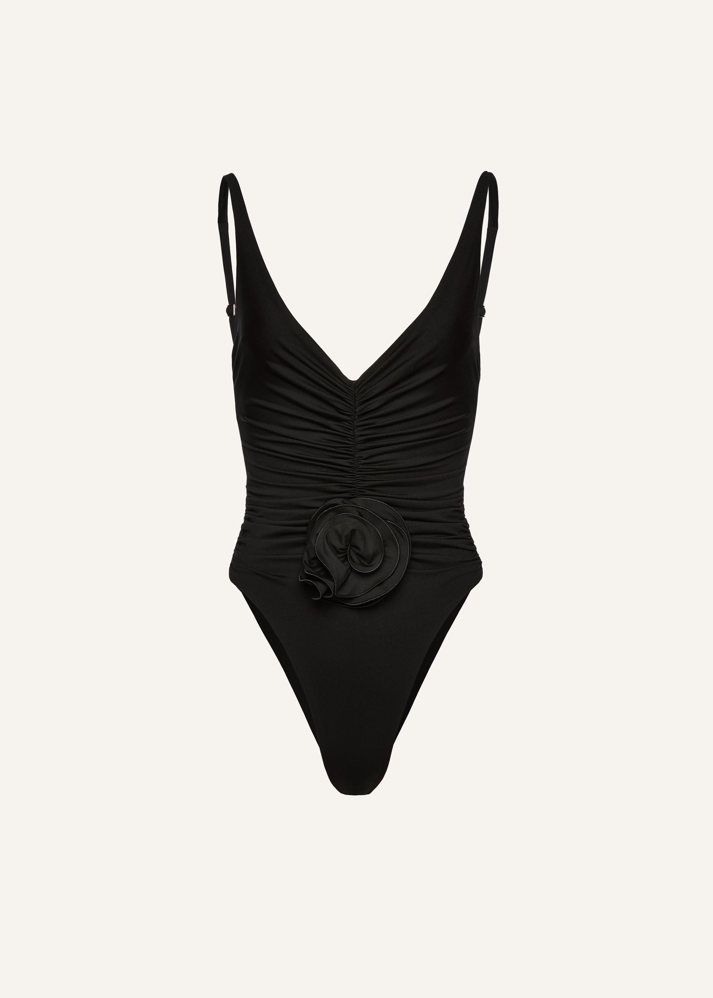 A one piece swimsuit with a v neckline and ruched throughout the body. Accentuated with a fixed flower in the front. Made from Italian fabrics.