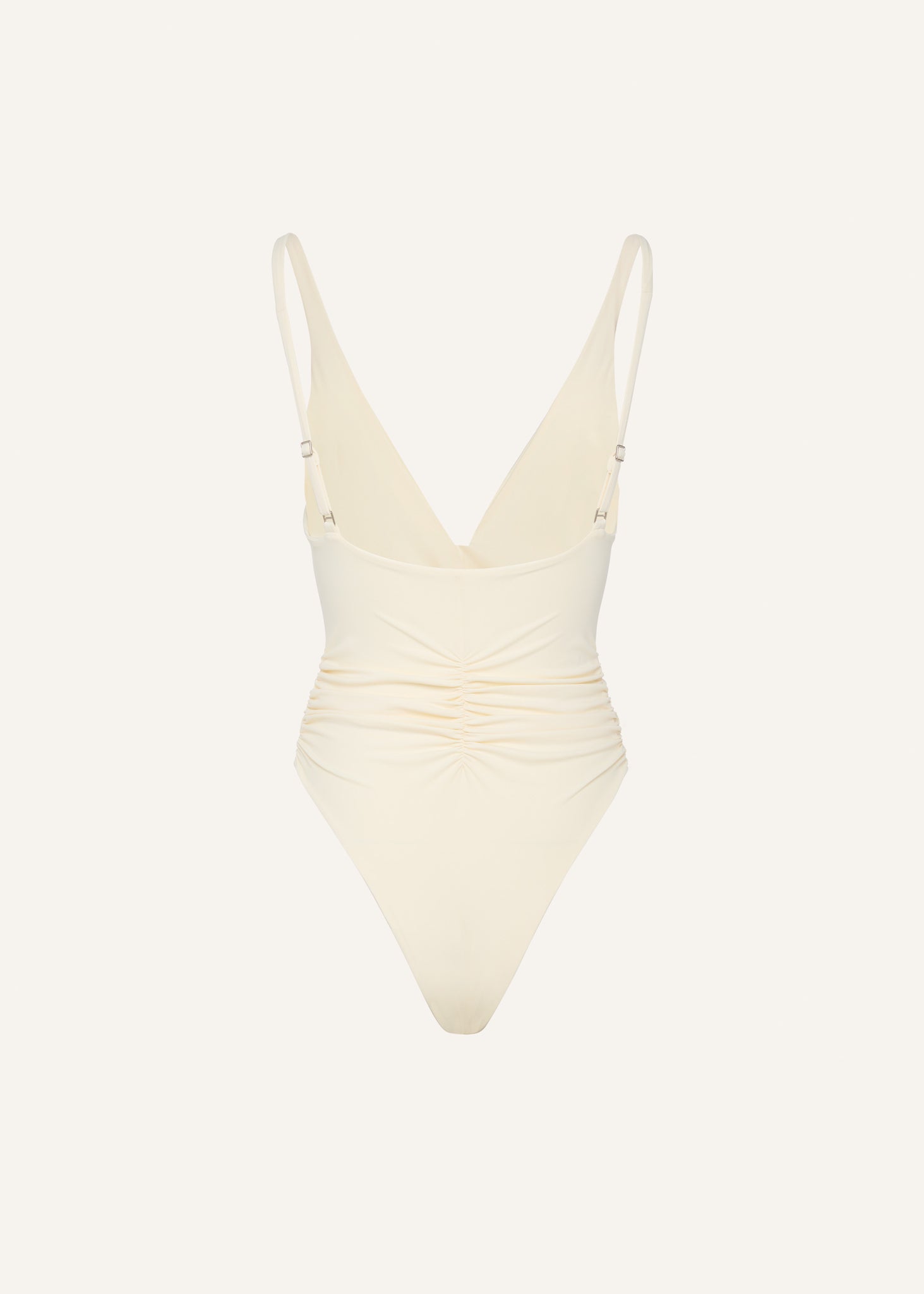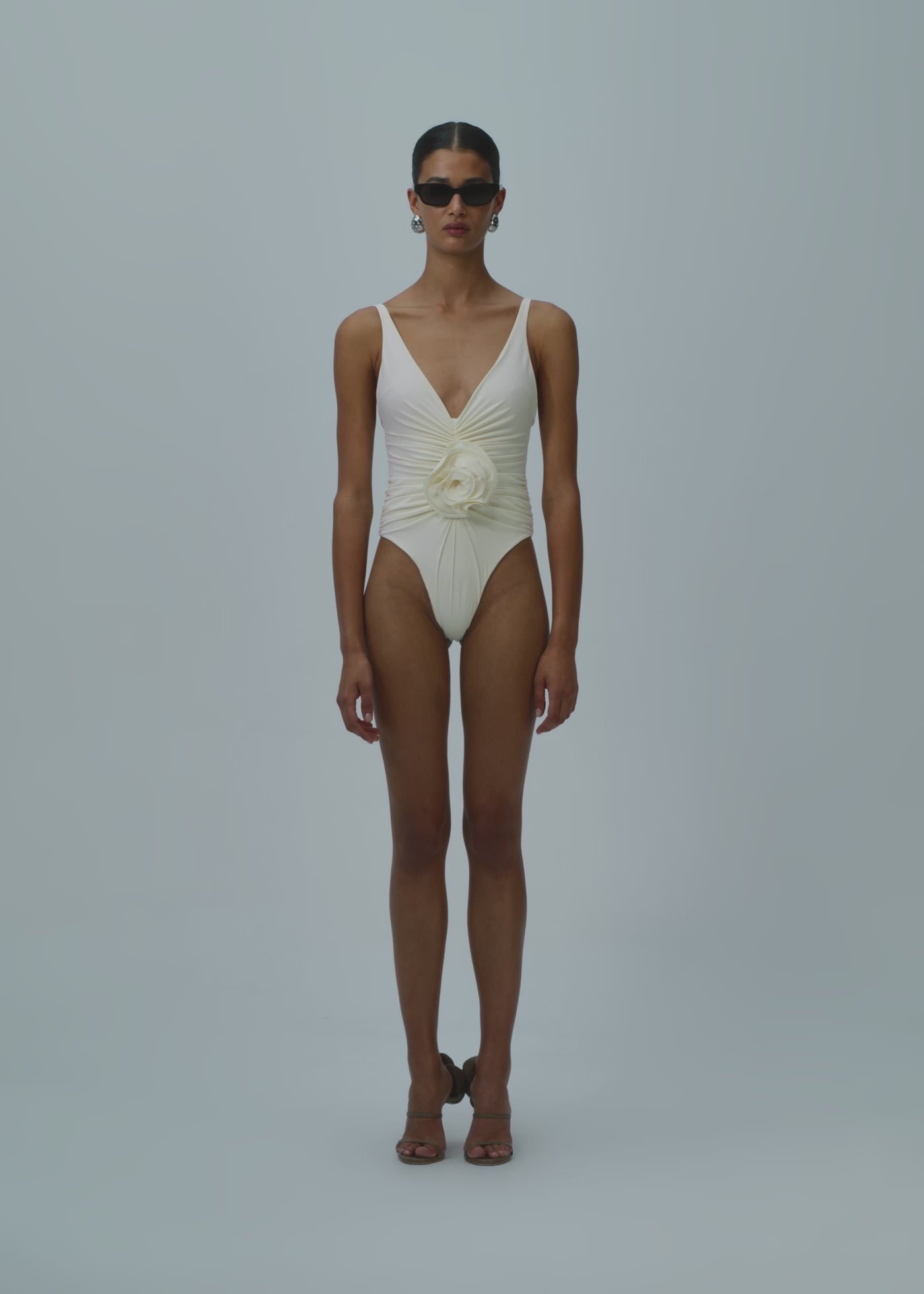 A one piece swimsuit with a v neckline and ruched throughout the body. Accentuated with a fixed flower in the front. Made from Italian fabrics.