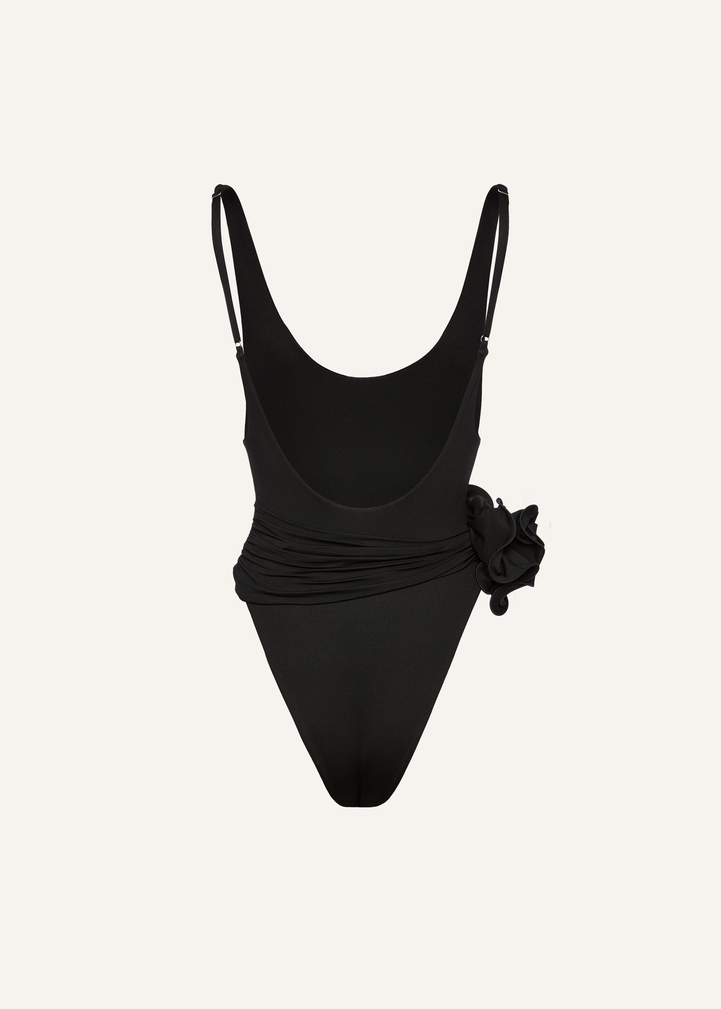 Slim fit swimsuit with adjustable thin straps. The front is adorned with draping just below the waist and a fixed flower. The deep decolte in the front and the back create beautiful lines on this versatile swimsuit.