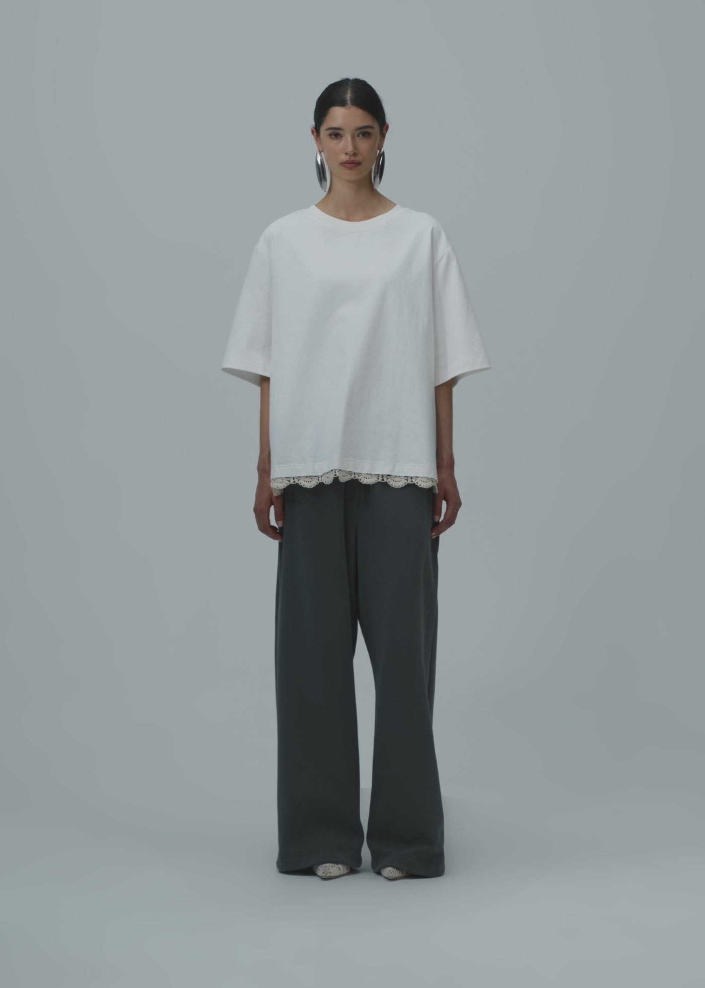 An oversized t-shirt made from cotton with a lace crochet detail at the hem.